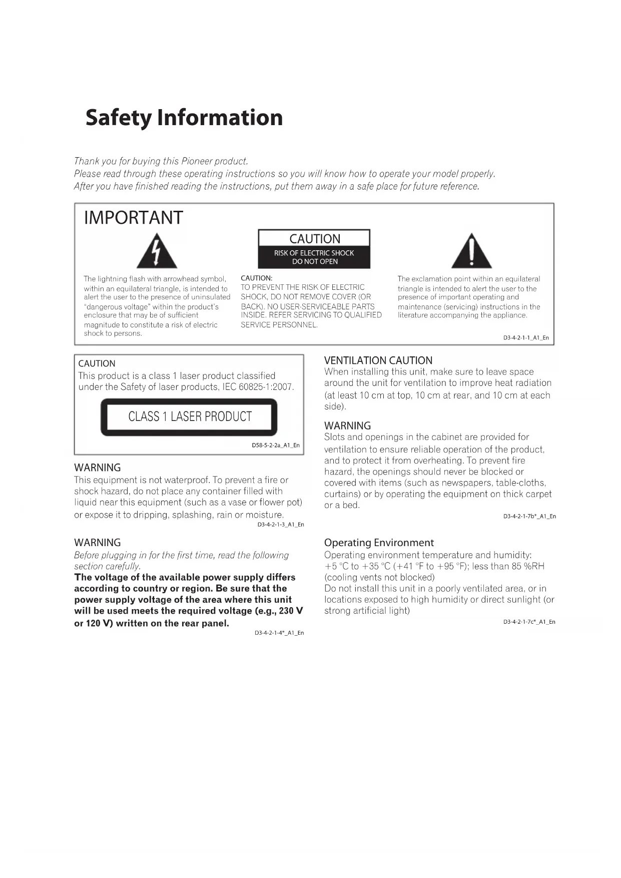 IMPORTANT D3-4-2-1-1_A1_En WARNING This equipment is not waterproof. To prevent a fire or shock hazard, do not place any container filled with liquid near this equipment (such as a vase or flower pot) or expose it to dripping, splashing, rain or moisture.D3-4-2-1-3_A1_En WARNING Before plugging in for the first time, read the following section carefully.The voltage of the available power supply differs according to country or region. Be sure that the power supply voltage of the area where this unit will be used meets the required voltage (e.g., 230 V or 120 V) written on the rear panel.D3-4-2-1-4*_A1_En VENTILATION CAUTION When installing this unit, make sure to leave space around the unit for ventilation to improve heat radiation (at least 10 cm at top, 10 cm at rear, and 10 cm at each side). WARNING Slots and openings in the cabinet are provided for ventilation to ensure reliable operation of the product, and to protect it from overheating. To prevent fire hazard, the openings should never be blocked or covered with items (such as newspapers, table-cloths, curtains) or by operating the equipment on thick carpet or a bed.D3-4-2-1-7b*_A1_EnCAUTIONThis product is a class 1 laser product classified under the Safety of laser products, IEC 60825-1:2007.