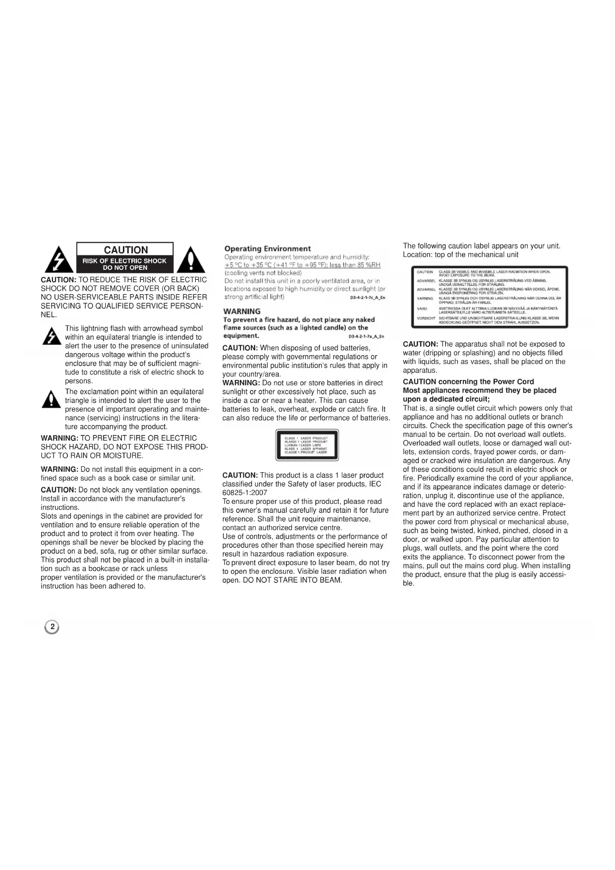 sunlight or other excessively hot place, such as inside a car or near a heater. This can cause batteries to leak, overheat, explode or catch fire. It can also reduce the life or performance of batteries. CAUTION: This product is a class 1 laser product classified under the Safety of laser products, IEC 60825-1:2007 To ensure proper use of this product, please read this owner’s manual carefully and retain it for future reference. Shall the unit require maintenance, contact an authorized service centre. Use of controls, adjustments or the performance of procedures other than those specified herein may result in hazardous radiation exposure. To prevent direct exposure to laser beam, do not try to open the enclosure. Visible laser radiation when open. DO NOT STARE INTO BEAM. The following caution label appears on your unit. Location: top of the mechanical unit CAUTION: The apparatus shall not be exposed to water (dripping or splashing) and no objects filled with liquids, such as vases, shall be placed on the apparatus. CAUTION concerning the Power Cord Most appliances recommend they be placed upon a dedicated circuit; That is, a single outlet circuit which powers only that appliance and has no additional outlets or branch circuits. Check the specification page of this owner's manual to be certain. Do not overload wall outlets. Overloaded wall outlets, loose or damaged wall out- lets, extension cords, frayed power cords, or dam- aged or cracked wire insulation are dangerous. Any of these conditions could result in electric shock or fire. Periodically examine the cord of your appliance, and if its appearance indicates damage or deterio- ration, unplug it, discontinue use of the appliance, and have the cord replaced with an exact replace- ment part by an authorized service centre. Protect the power cord from physical or mechanical abuse, such as being twisted, kinked, pinched, closed in a door, or walked upon. Pay particular attention to plugs, wall outlets, and the point where the cord exits the appliance. To disconnect power from the mains, pull out the mains cord plug. When installing the product, ensure that the plug is easily accessi- ble. CAUTION