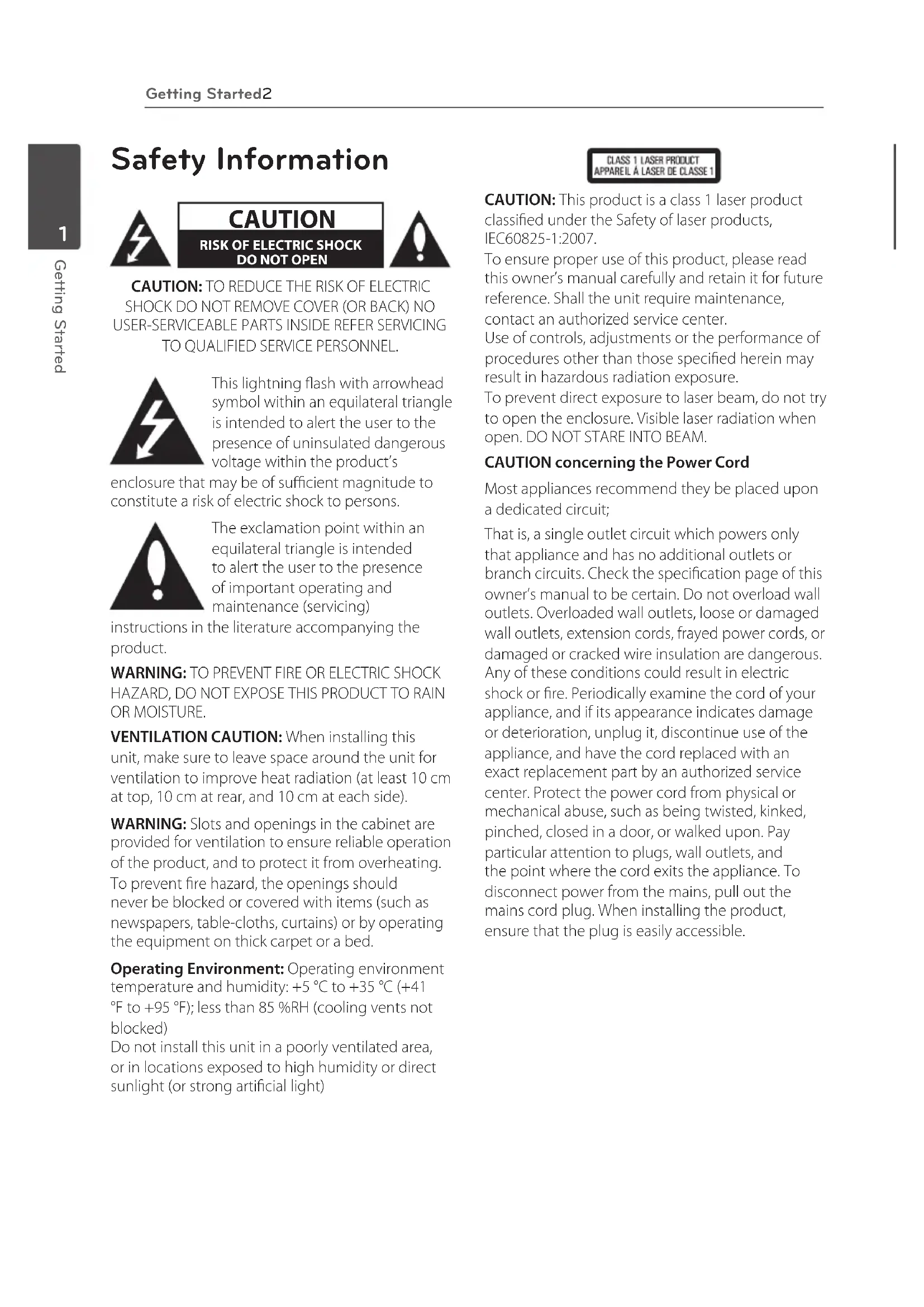 provided for ventilation to ensure reliable operation of the product, and to protect it from overheating. To prevent re hazard, the openings should never be blocked or covered with items (such as newspapers, table-cloths, curtains) or by operating the equipment on thick carpet or a bed. Operating Environment: Operating environment temperature and humidity: +5 °C to +35 °C (+41 °F to +95 °F); less than 85 %RH (cooling vents not blocked) Do not install this unit in a poorly ventilated area, or in locations exposed to high humidity or direct sunlight (or strong articial light) CAUTION: This product is a class 1 laser product classied under the Safety of laser products, IEC60825-1:2007. To ensure proper use of this product, please read this owner’s manual carefully and retain it for future reference. Shall the unit require maintenance, contact an authorized service center. Use of controls, adjustments or the performance of procedures other than those specied herein may result in hazardous radiation exposure. To prevent direct exposure to laser beam, do not try to open the enclosure. Visible laser radiation when open. DO NOT STARE INTO BEAM. CAUTION concerning the Power Cord Most appliances recommend they be placed upon a dedicated circuit; That is, a single outlet circuit which powers only that appliance and has no additional outlets or branch circuits. Check the specication page of this owner’s manual to be certain. Do not overload wall outlets. Overloaded wall outlets, loose or damaged wall outlets, extension cords, frayed power cords, or damaged or cracked wire insulation are dangerous. Any of these conditions could result in electric shock or re. Periodically examine the cord of your appliance, and if its appearance indicates damage or deterioration, unplug it, discontinue use of the appliance, and have the cord replaced with an exact replacement part by an authorized service center. Protect the power cord from physical or mechanical abuse, such as being twisted, kinked, pinched, closed in a door, or walked upon. Pay particular attention to plugs, wall outlets, and the point where the cord exits the appliance. To disconnect power from the mains, pull out the mains cord plug. When installing the product, ensure that the plug is easily accessible. HB916-MD0_BUSAPPK_ENG.indd 2 2011-09-23 9:02:38Getting Started 3 Getting Started