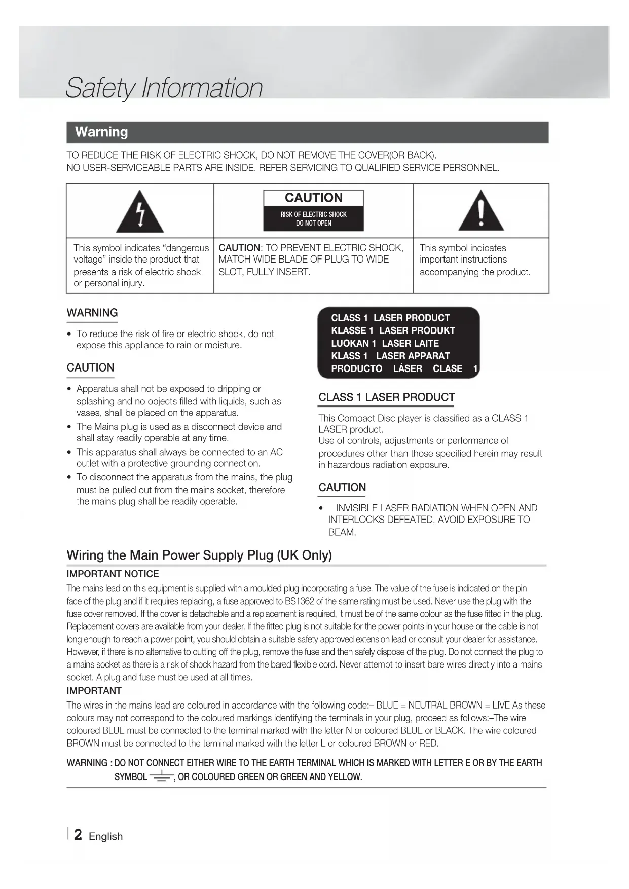 Safety Information Copyright © 2013 Samsung Electronics Co.,Ltd.All rights reserved; No part or whole of this user’s manual may be reproduced or copied without the prior written permission of Samsung Electronics Co.,Ltd. Contents SAFETY INFORMATION2 Warning3 Disc Storage & Management3 Handling Cautions3 Licence4 Using the 3D Function5 CopyrightGETTING STARTED6 Disk and Format Compatibility7 Logos of Discs the Product can Play10 Accessories10 Attaching the Toroidal Ferrite Core to the Lan Cable of the Product11 Front Panel11 Rear Panel12 Remote ControlCONNECTIONS14 Connecting the Speakers17 Connecting to TV/External Devices18 Connecting to a Network RouterSETTINGS19 The Initial Settings Procedure19 The Home Screen19 Accessing the Settings Screen20 Settings Menu Functions24 Networks and the Internet27 Upgrading SoftwareMEDIA PLAY29 The All Content Screen29 Playing Commercial Discs29 Playing Files on a USB Device30 Playing a Disc with User Recorded Content30 Using the AllShare Network Function31 Controlling Video Playback34 Controlling Music Playback38 Playing Photo Contents39 Listening to Radio41 Using the Special Effects Remote Control ButtonsNETWORK SERVICES43 Logging In to Your Samsung Account43 Before Using Movies & TV Shows or Apps44 Using Movies & TV Shows44 Using Apps48 Using the Web Browser51 Linking your Internet Service Accounts to the Product51 BD-LIVE™APPENDIX52 Additional Information55 Troubleshooting58 Specifications