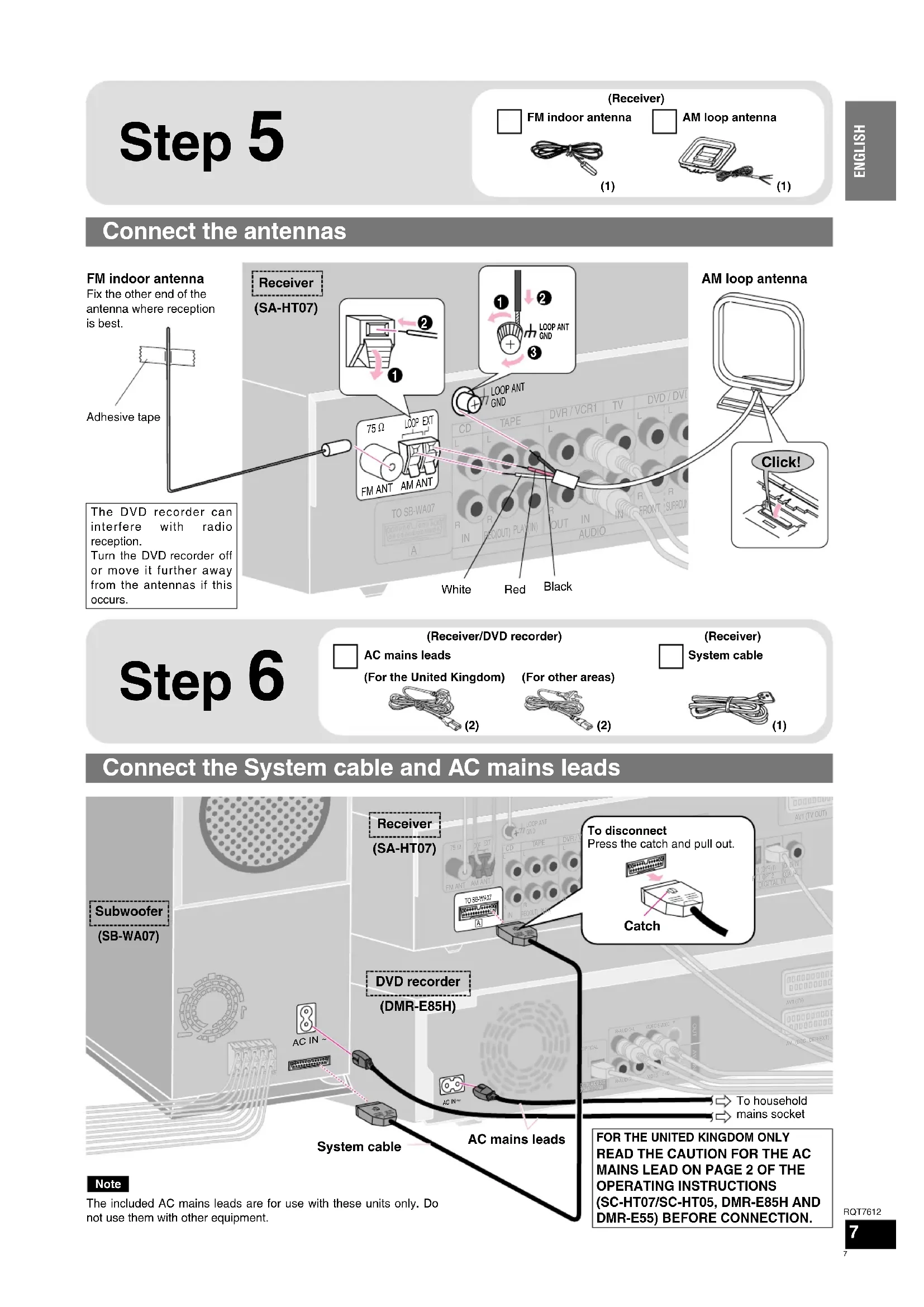 AUDIOVIDEOAC IN ~ Connect the System cable and AC mains leads To household mains socket AC mains leads Receiver (SA-HT07) DVD recorder (DMR-E85H) Subwoofer (SB-WA07) System cable (Receiver/DVD recorder) AC mains leads Click! (For the United Kingdom) (For other areas) (Receiver) Catch To disconnect Press the catch and pull out. Receiver (SA-HT07) The DVD recorder can interfere with radio reception. Turn the DVD recorder off or move it further away from the antennas if this occurs. System cable