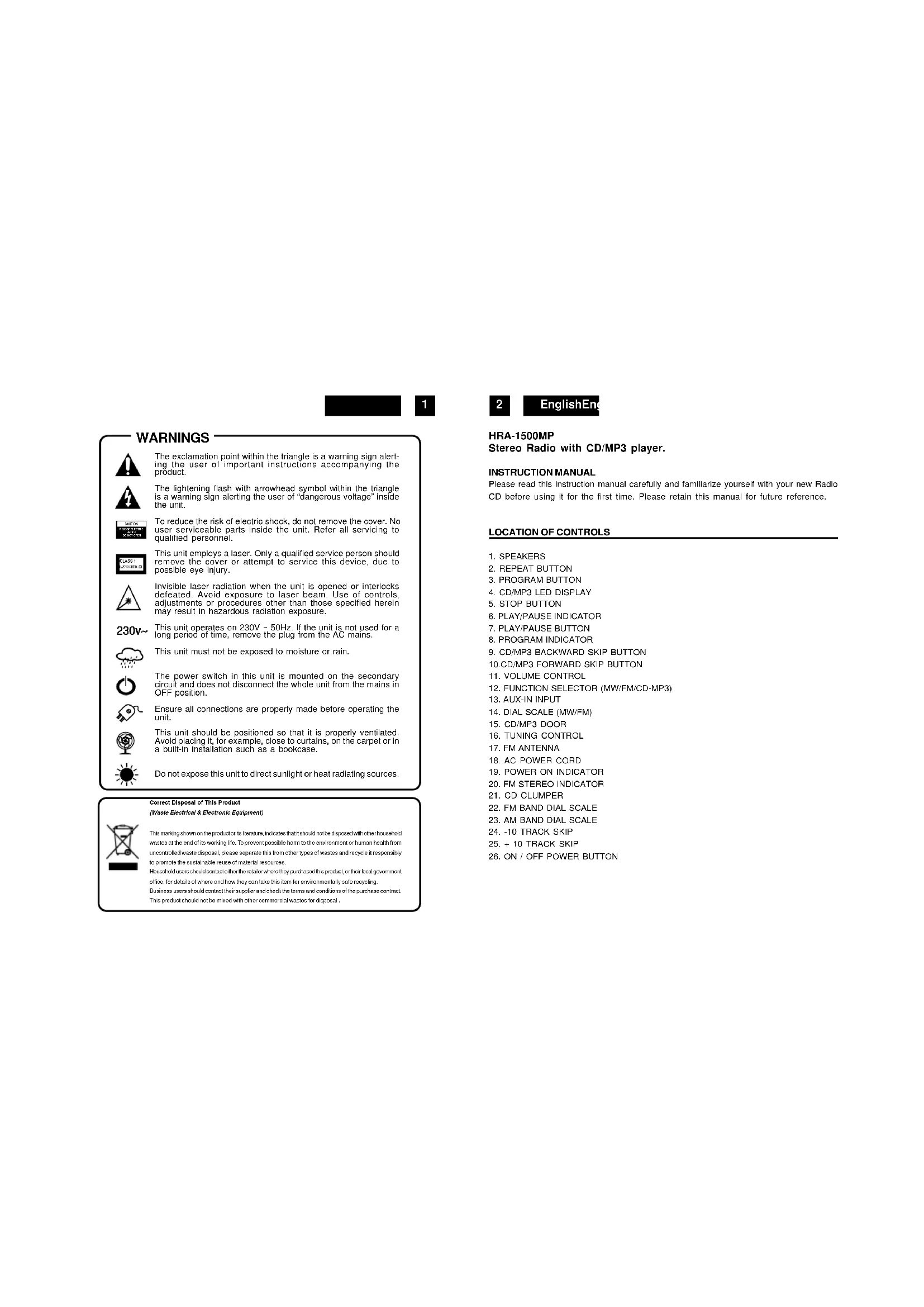 1. SPEAKERS2. REPEAT BUTTON3. PROGRAM BUTTON4. CD/MP3 LED DISPLAY5. STOP BUTTON6. PLAY/PAUSE INDICATOR7. PLAY/PAUSE BUTTON8. PROGRAM INDICATOR9. CD/MP3 BACKWARD SKIP BUTTON10.CD/MP3 FORWARD SKIP BUTTON11. VOLUME CONTROL12. FUNCTION SELECTOR (MW/FM/CD-MP3)13. AUX-IN INPUT14. DIAL SCALE (MW/FM)15. CD/MP3 DOOR16. TUNING CONTROL17. FM ANTENNA18. AC POWER CORD19. POWER ON INDICATOR20. FM STEREO INDICATOR21. CD CLUMPER22. FM BAND DIAL SCALE23. AM BAND DIAL SCALE24. -10 TRACK SKIP25. + 10 TRACK SKIP26. ON / OFF POWER BUTTON Correct Disposal of This Product (Waste Electrical & Electronic Equipment) This marking shown on the product or its literature, indicates that it should not be disposed with other household wastes at the end of its working life. To prevent possible harm to the environment or human health from uncontrolled waste disposal, please separate this from other types of wastes and recycle it responsibly to promote the sustainable reuse of material resources. Household users should contact either the retailer where they purchased this product, or their local government office, for details of where and how they can take this item for environmentally safe recycling. Business users should contact their supplier and check the terms and conditions of the purchase contract. This product should not be mixed with other commercial wastes for disposal .EnglishEnglish
