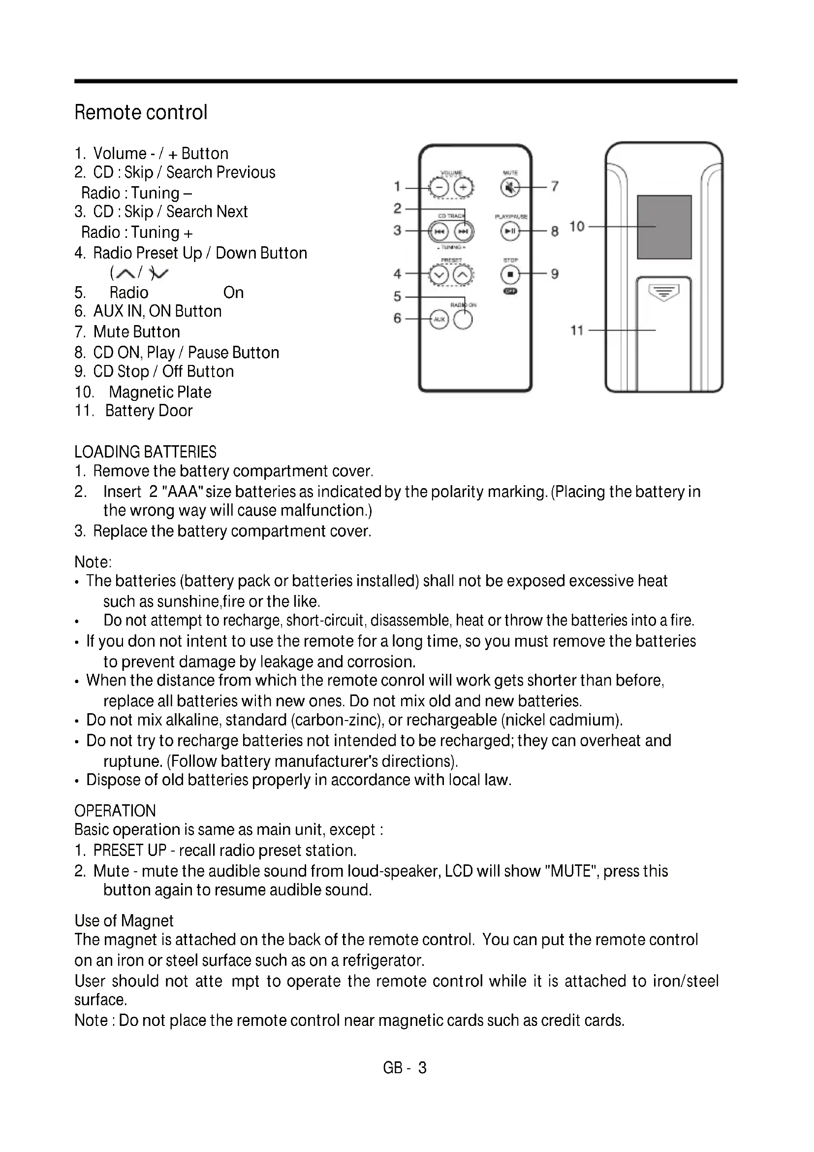 Note : Do not place the remote control near magnetic cards such as credit cards.