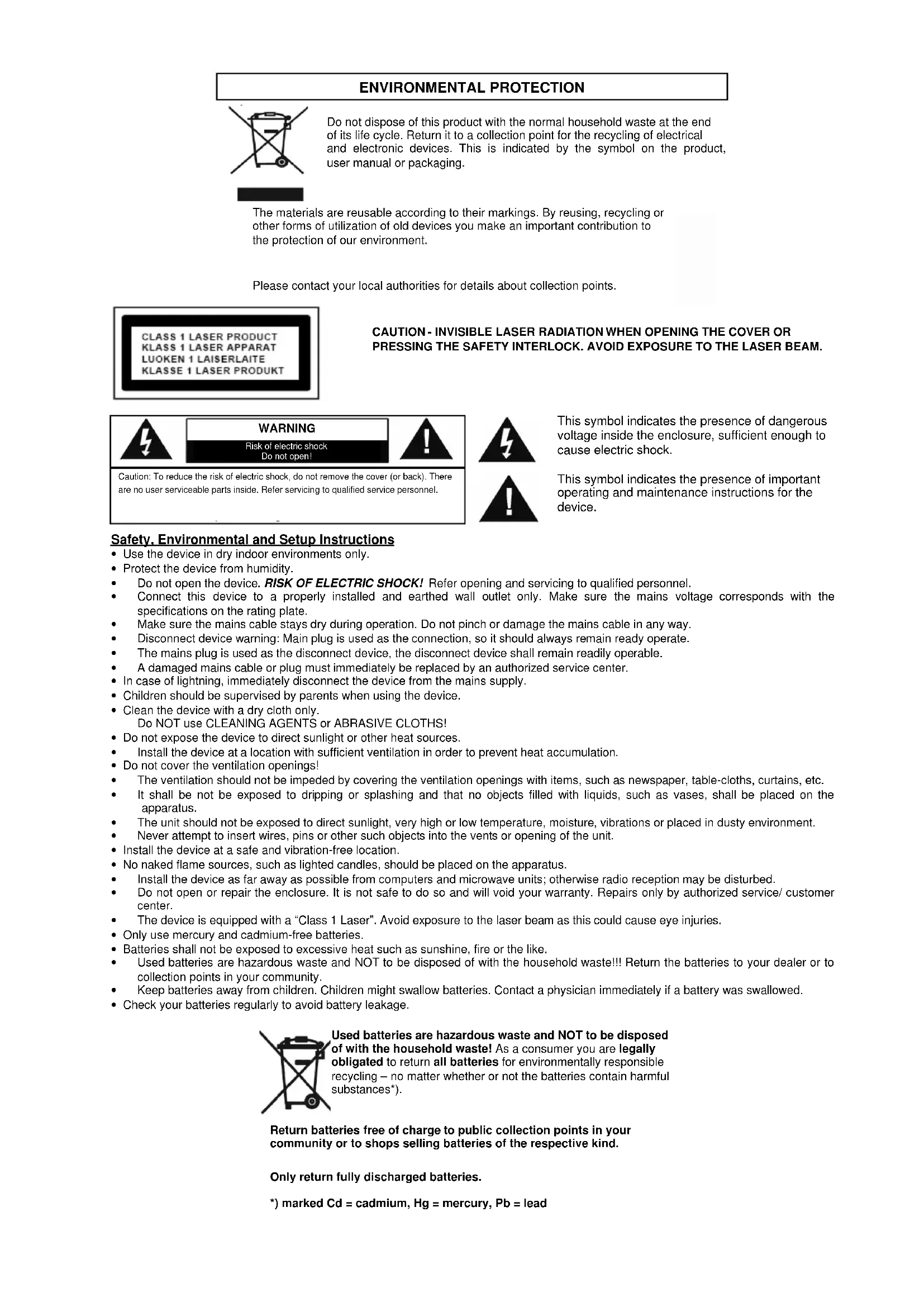 The device is equipped with a "Class 1 Laser". Avoid exposure to the laser beam as this could cause eye injuries. - Only use mercury and cadmium-free batteries.