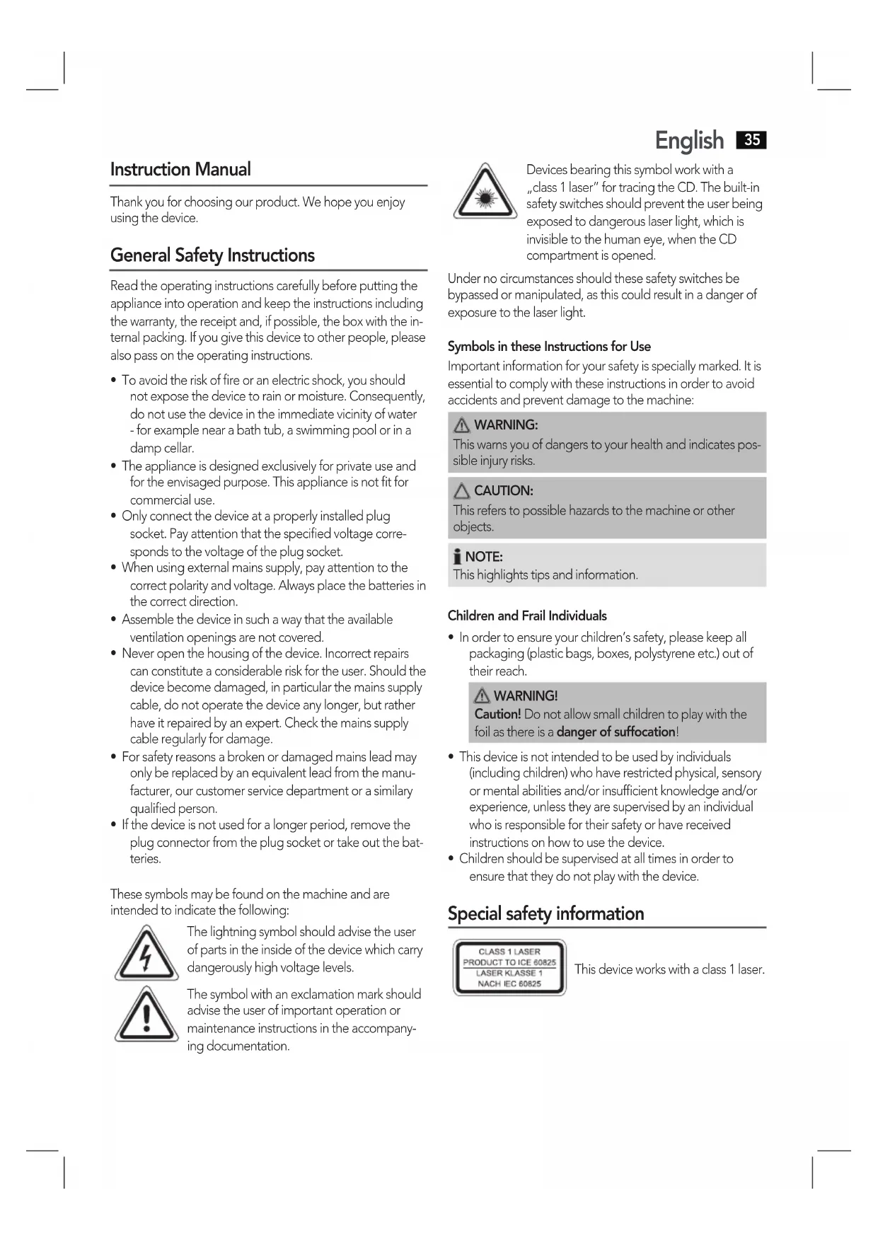 - Children should be supervised at all times in order to ensure that they do not play with the device. Special safety information This device works with a class 1 laser.English