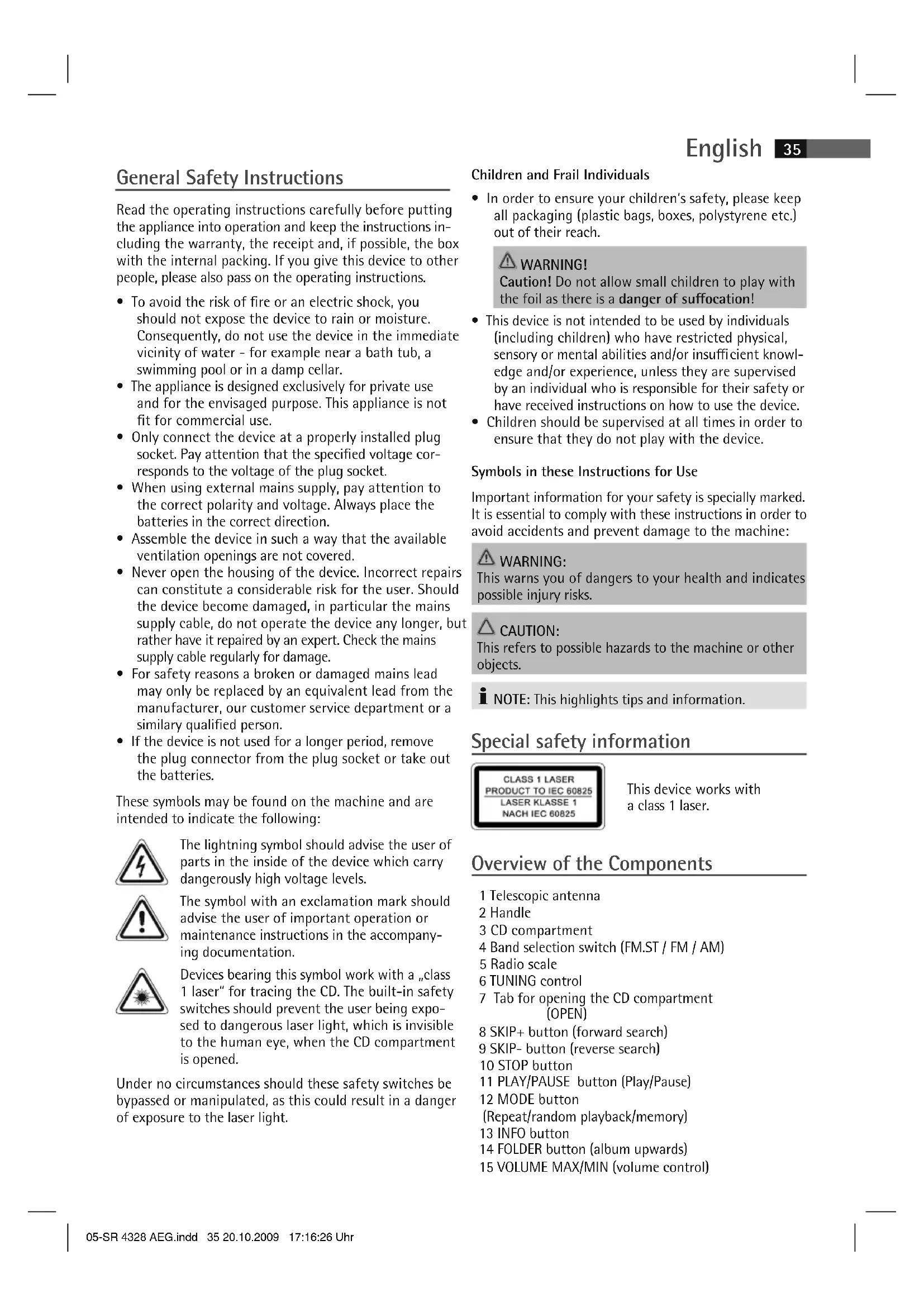 This warns you of dangers to your health and indicates possible injury risks. CAUTION: This refers to possible hazards to the machine or other objects. NOTE: This highlights tips and information. Special safety information This device works with a class 1 laser. Overview of the Components 1 Telescopic antenna 2 Handle 3 CD compartment 4 Band selection switch (FM.ST / FM / AM) 5 Radio scale 6 TUNING control 7 Tab for opening the CD compartment (OPEN) 8 SKIP+ button (forward search) 9 SKIP- button (reverse search) 10 STOP button 11 PLAY/PAUSE button (Play/Pause) 12 MODE button (Repeat/random playback/memory) 13 INFO button 14 FOLDER button (album upwards) 15 VOLUME MAX/MIN (volume control) 05-SR 4328 AEG.indd 35 20.10.2009 17:16:26 UhrEnglish