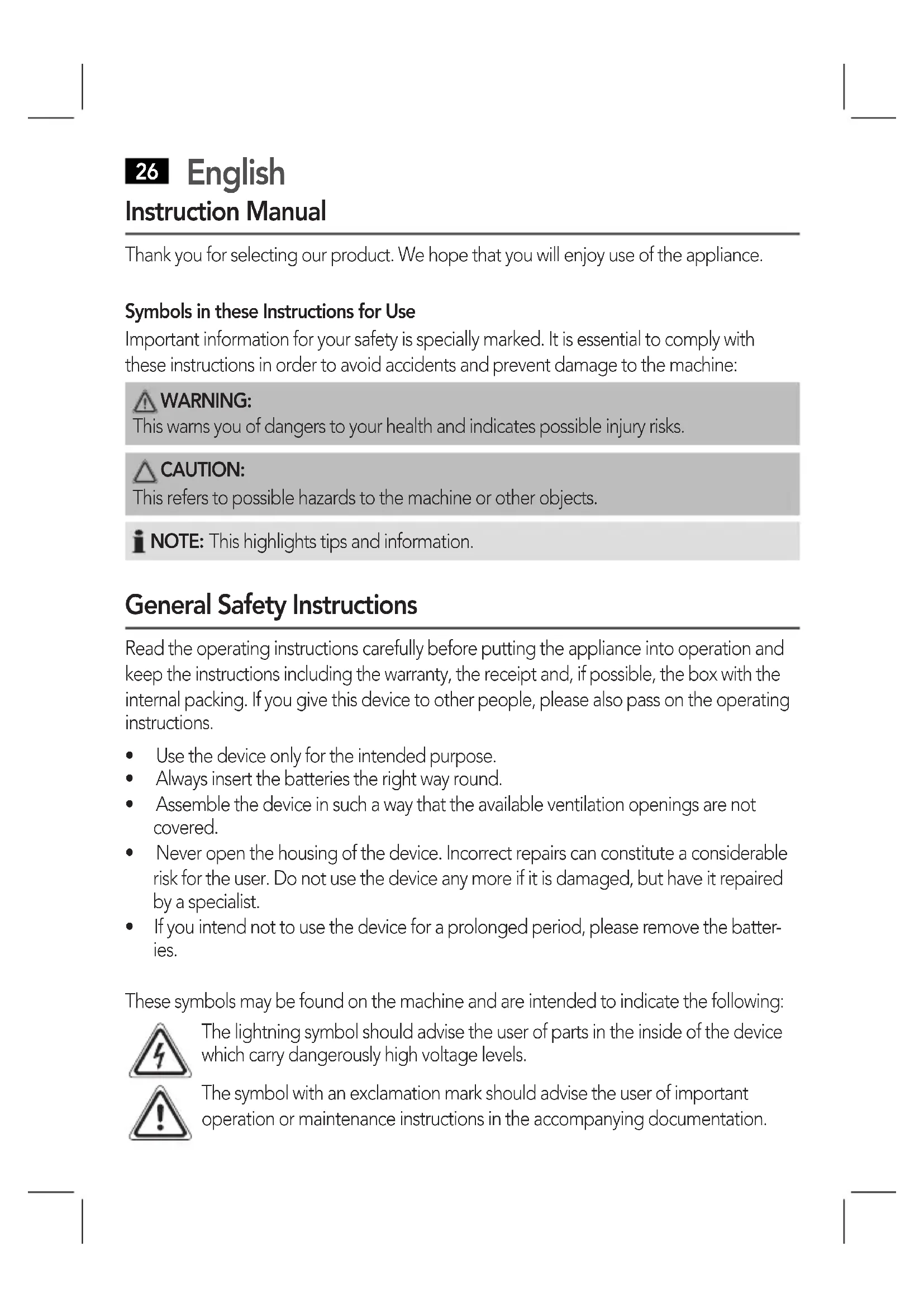 - Ifyouintendnottousethedeviceforaprolongedperiod,pleaseremovethebatter- ies. These symbols may be found on the machine and are intended to indicate the following: The lightning symbol should advise the user of parts in the inside of the device which carry dangerously high voltage levels. The symbol with an exclamation mark should advise the user of important operation or maintenance instructions in the accompanying documentation.English