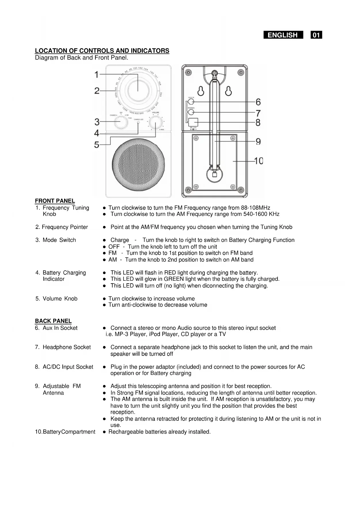 z Charge - Turn the knob to right to switch on Battery Charging Function z OFF - Turn the knob left to turn off the unit z FM - Turn the knob to 1st position to switch on FM band z AM - Turn the knob to 2nd position to switch on AM band