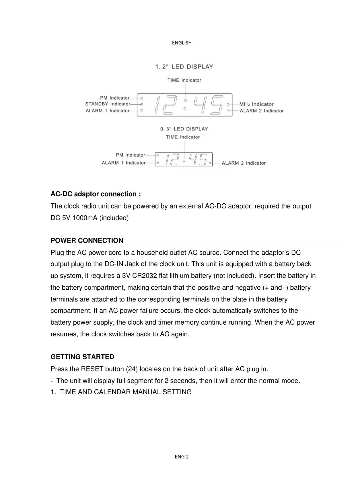 Plug the AC power cord to a household outlet AC source. Connect the adaptor's DC output plug to the DC-IN Jack of the clock unit. This unit is equipped with a battery backup system, it requires a 3V CR2032 flat lithium battery (not included). Insert the battery in the battery compartment, making certain that the positive and negative (+ and -) battery terminals are attached to the corresponding terminals on the plate in the battery compartment. If an AC power failure occurs, the clock automatically switches to the battery power supply, the clock and timer memory continue running. When the AC power resumes, the clock switches back to AC again.