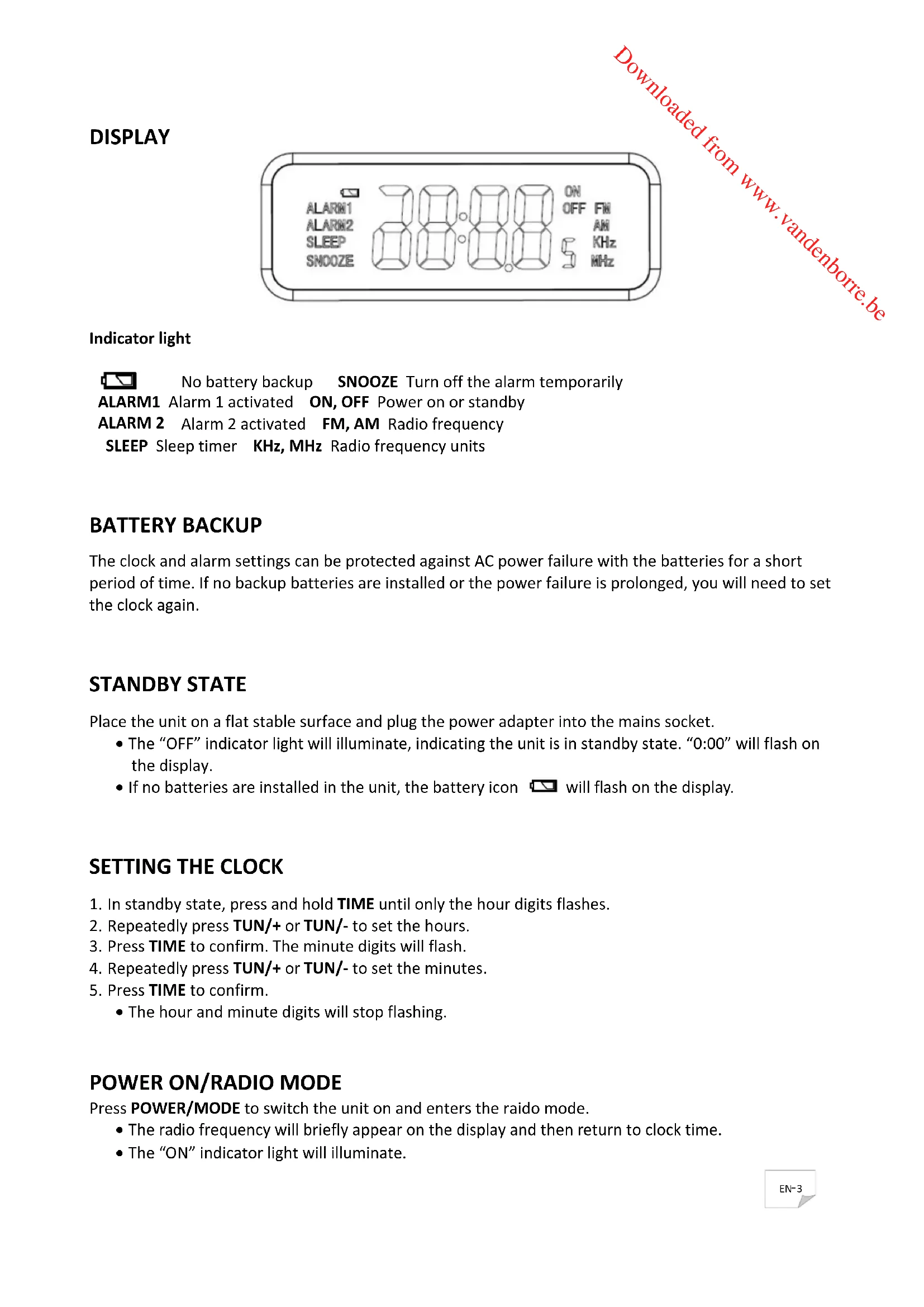 Press POWER/MODE to switch the unit on and enters the raido mode. The radio frequency will briefly appear on the display and then return to clock time. The “ON” indicator light will illuminate. Downloaded from www.vandenborre.beEN