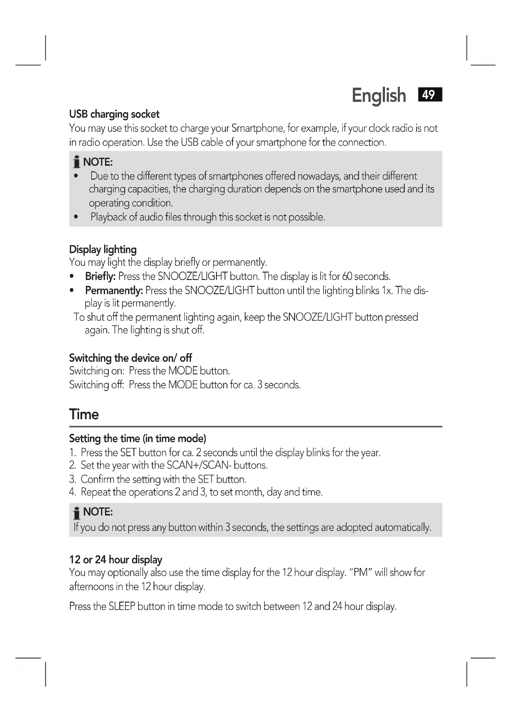 - Permanently:PresstheSNOOZE/LIGHTbuttonuntilthelightingblinks1x.Thedis- play is lit permanently. To shut off the permanent lighting again, keep the SNOOZE/LIGHT button pressed again. The lighting is shut off. Switching the device on/ off Switching on: Press the MODE button. Switching off: Press the MODE button for ca. 3 seconds. Time Setting the time (in time mode)