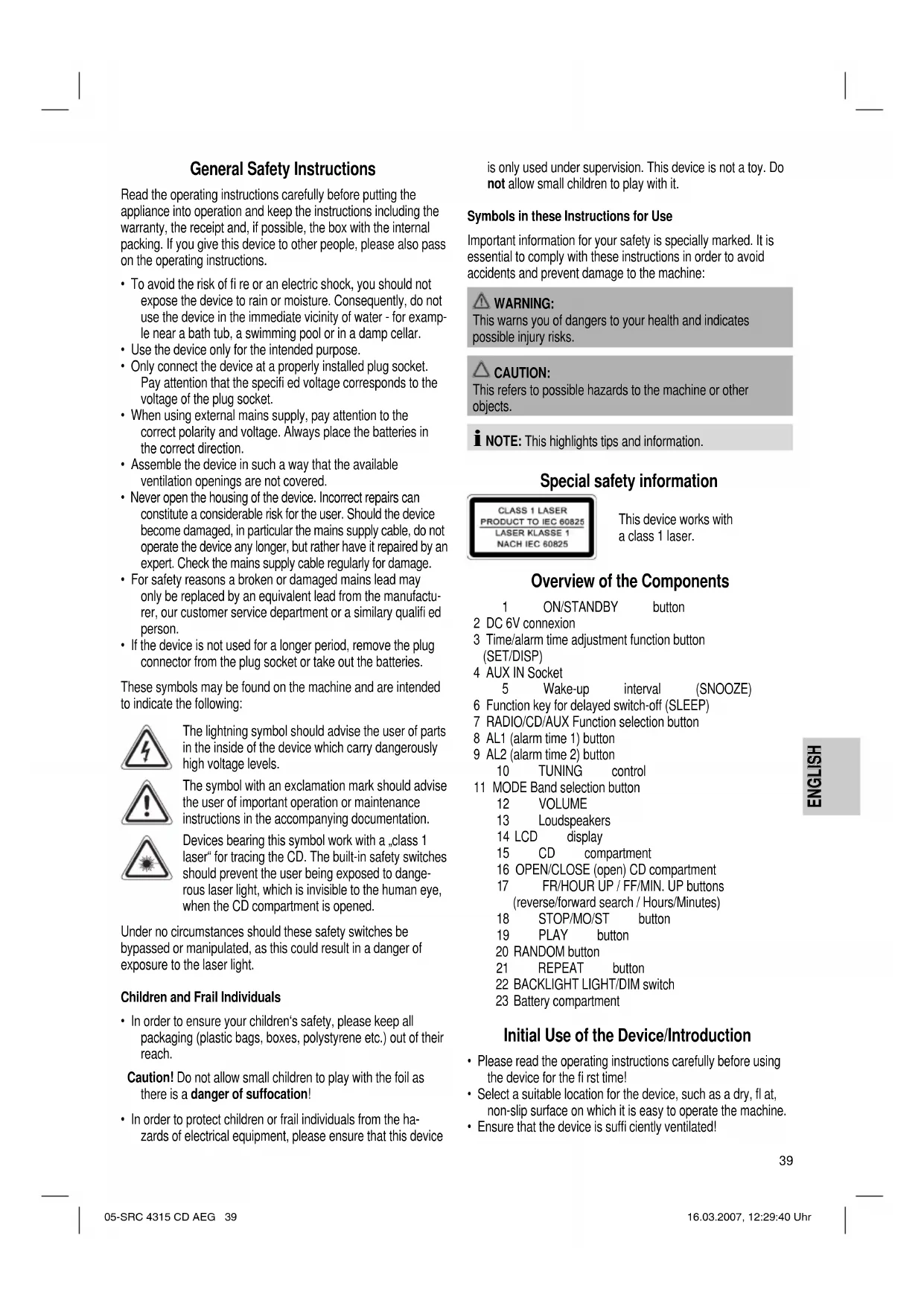 - Ensure that the device is suffi ciently ventilated! 05-SRC 4315 CD AEG 39 16.03.2007, 12:29:40 UhrENGLISH ENGLISH