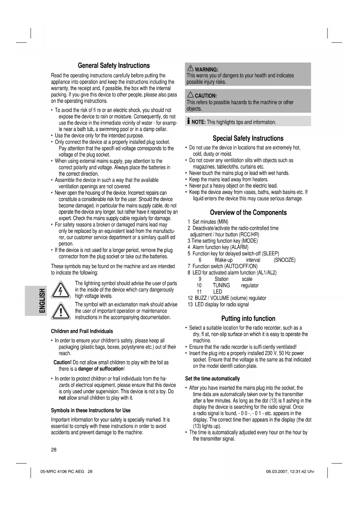 - Do not dip the appliance in water. Technical Data Model: ................................................................. MRC 4106 RC Power supply: ........................................................ 230 V, 50 Hz Power consumption: ............................................................ 3 W Battery power reserve: ................................2 x 1,5V „R03/AAA“ Frequency range: ...............................UKW / FM 88 ~ 108 MHz This device has been tested according to all relevant current CE guidelines, such as electromagnetic compatibility and low voltage directives, and has been constructed in accordance with the latest safety regulations. Subject to technical changes without prior notice! Guarantee The device supplied by our Company is covered by a 24 month guarantee starting on the date of purchase (receipt). During the life of the guarantee any fault of the device or its accessories ascribable to material or manufacturing defects will be eliminated free of charge by repairing or, at our discretion, by replacing it. The guarantee services do not entail an extension of the life of the guarantee nor do they give rise to any right to a new guarantee! Proof of the guarantee is provided by the proof of purchase. Without proof of purchase no free replacement or repair will be carried out. If you wish to make a claim under the guarantee please return the entire machine in the original packaging to your dealer together with the receipt. Defects to consumables or parts subject to wearing as well as cleaning, maintenance or the replacement of said parts are not covered by the guarantee and hence are to be paid! The guarantee lapses in case of unauthorized tampering. After the expiry of the guarantee After the expiry of the guarantee repairs can be carried by the competent dealer or repair service against the payment of the ensuing costs. Meaning of the “Dustbin” Symbol Protect our environment: do not dispose of electrical equipment in the domestic waste. Please return any electrical equipment that you will no longer use to the collection points provided for their disposal. This helps avoid the potential effects of incorrect disposal on the environment and human health. This will contribute to the recycling and other forms of reutilisati- on of electrical and electronic equipment. Information concerning where the equipment can be disposed of can be obtained from your local authority. 05-MRC 4106 RC AEG 30 06.03.2007, 12:31:47 Uhr31