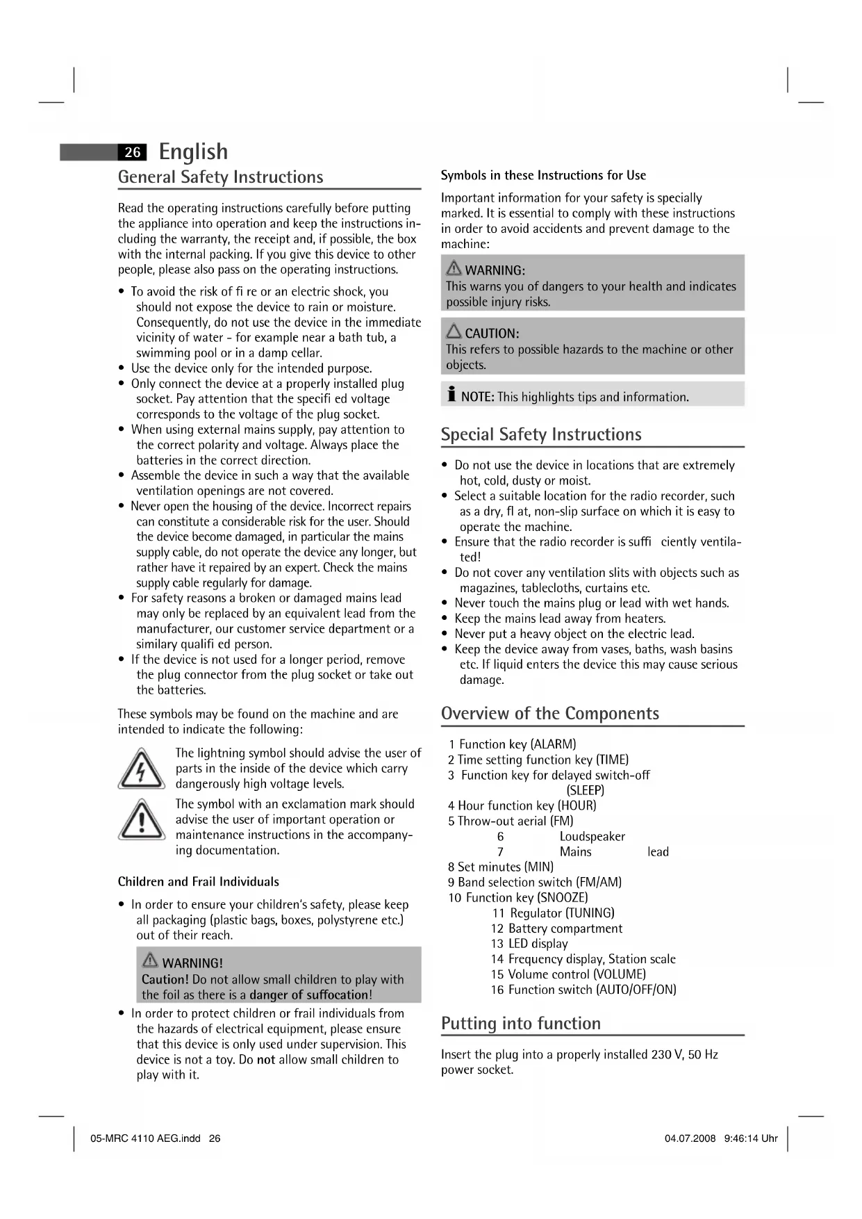- Keep the device away from vases, baths, wash basins etc. If liquid enters the device this may cause serious damage. Overview of the Components 1 Function key (ALARM) 2 Time setting function key (TIME) 3 Function key for delayed switch-o (SLEEP) 4 Hour function key (HOUR) 5 Throw-out aerial (FM) 6 Loudspeaker 7 Mains lead 8 Set minutes (MIN) 9 Band selection switch (FM/AM) 10 Function key (SNOOZE) 11 Regulator (TUNING) 12 Battery compartment 13 LED display 14 Frequency display, Station scale 15 Volume control (VOLUME) 16 Function switch (AUTO/OFF/ON) Putting into function Insert the plug into a properly installed 230 V, 50 Hz power socket. 05-MRC 4110 AEG.indd 2605-MRC 4110 AEG.indd 26 04.07.2008 9:46:14 Uhr04.07.2008 9:46:14 UhrEnglish