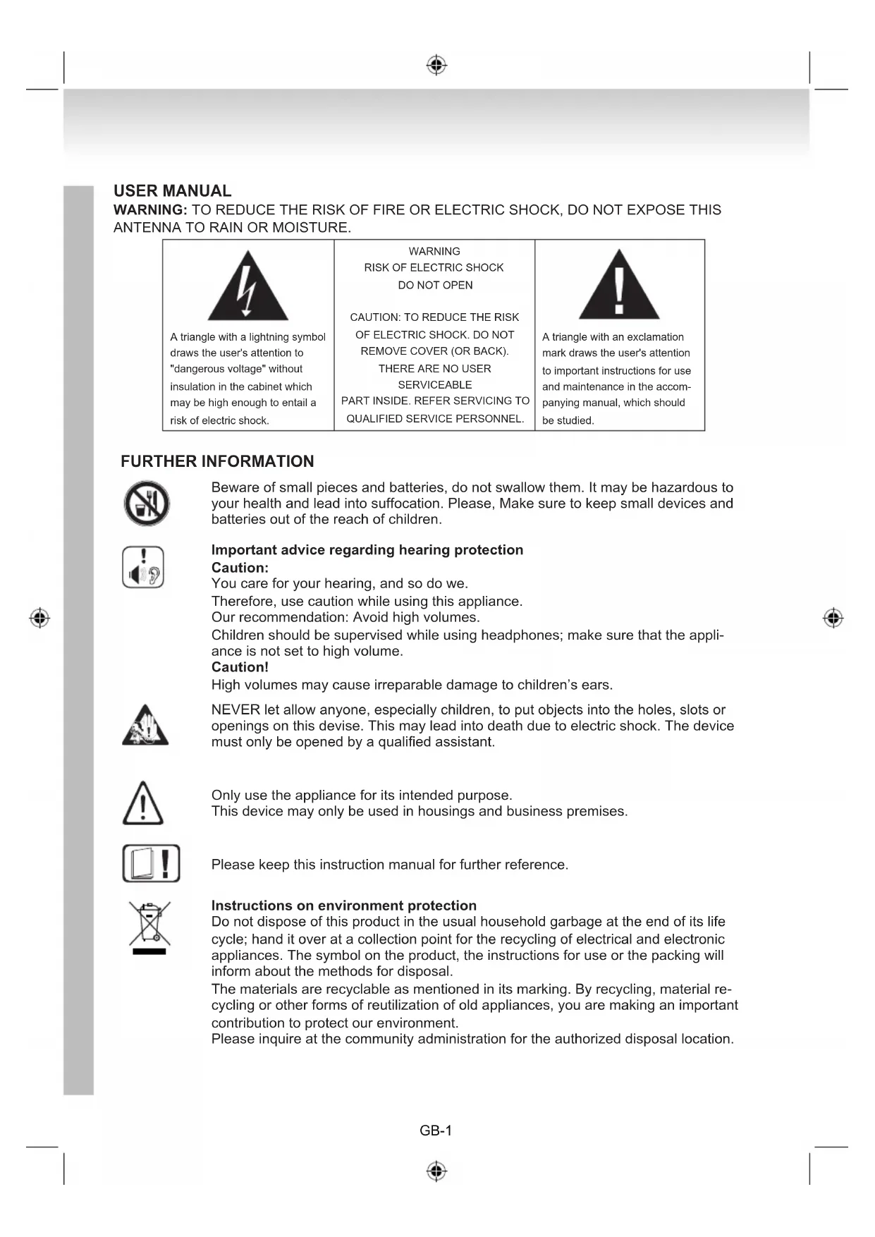 QUALIFIED SERVICE PERSONNEL. A triangle with an exclamation mark draws the user's attention to important instructions for use and maintenance in the accom- panying manual, which should be studied. FURTHER INFORMATION Beware of small pieces and batteries, do not swallow them. It may be hazardous to your health and lead into suffocation. Please, Make sure to keep small devices and batteries out of the reach of children. Important advice regarding hearing protection Caution: You care for your hearing, and so do we. Therefore, use caution while using this appliance. Our recommendation: Avoid high volumes. Children should be supervised while using headphones; make sure that the appli- ance is not set to high volume. Caution! High volumes may cause irreparable damage to children’s ears. NEVER let allow anyone, especially children, to put objects into the holes, slots or openings on this devise. This may lead into death due to electric shock. The device must only be opened by a qualied assistant. Only use the appliance for its intended purpose. This device may only be used in housings and business premises. Please keep this instruction manual for further reference. Instructions on environment protection Do not dispose of this product in the usual household garbage at the end of its life cycle; hand it over at a collection point for the recycling of electrical and electronic appliances. The symbol on the product, the instructions for use or the packing will inform about the methods for disposal. The materials are recyclable as mentioned in its marking. By recycling, material re- cycling or other forms of reutilization of old appliances, you are making an important contribution to protect our environment. Please inquire at the community administration for the authorized disposal location. GB-1Do not obstruct the ventilation of the device. Make sure, that no curtains, newspa- pers, furniture or any other type of object are blocking the ventilation system of the apparatus. The ventilation system must be clear of objects at all times! Overheating may lead into serious damage of the device and reduce its performance and lifespan. Heat and warmth Do not expose the appliance to direct sunlight. Make sure that the appliance is not subject to direct heat sources such as heaters or open re. Make sure that the venti- lation slots of the appliance are not covered. Moisture and cleaning This appliance is not waterproof! Do not immerse the device in water. Do not allow player to come in contact with water. If water gets inside the device it may cause seri- ous damage. Do not use cleaning agents that contain alcohol, ammoniac, benzene or abrasives as these could damage the device. For cleaning, use a soft, moistened cloth. Professional recycling Batteries and packaging should not be disposed of in the trash. Batteries must be handed over to a collection centre for used batteries. Separating disposable packag- ing materials is ecologically friendly.