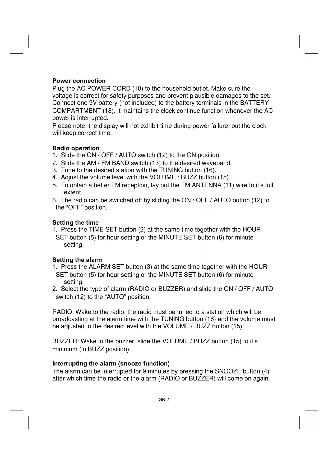 switch (12) to the “AUTO” position. RADIO: Wake to the radio, the radio must be tuned to a station which will be broadcasting at the alarm time with the TUNING button (16) and the volume must be adjusted to the desired level with the VOLUME / BUZZ button (15). BUZZER: Wake to the buzzer, slide the VOLUME / BUZZ button (15) to it’s minimum (in BUZZ position). Interrupting the alarm (snooze function) The alarm can be interrupted for 9 minutes by pressing the SNOOZE button (4) after which time the radio or the alarm (RADIO or BUZZER) will come on again.GB-3 To shut the alarm off To shut off the alarm, press the ALARM OFF button (1) once and the alarm time will be reset for the next day. Slide the ON / OFF / AUTO switch (12) to the “OFF” position tom turn off the alarm and not set it for the next day. Sleep function