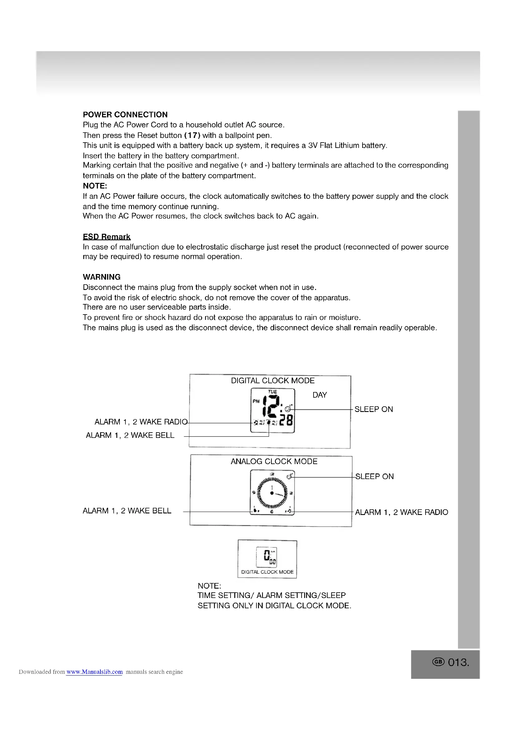 DIGITAL CLOCK MODE DAY SLEEP ON ALARM 1, 2 WAKE RADIO ALARM 1, 2 WAKE BELL ANALOG CLOCK MODE SLEEP ON ALARM 1, 2 WAKE BELL ALARM 1, 2 WAKE RADIO DIGITAL CLOCK MODENOTE: