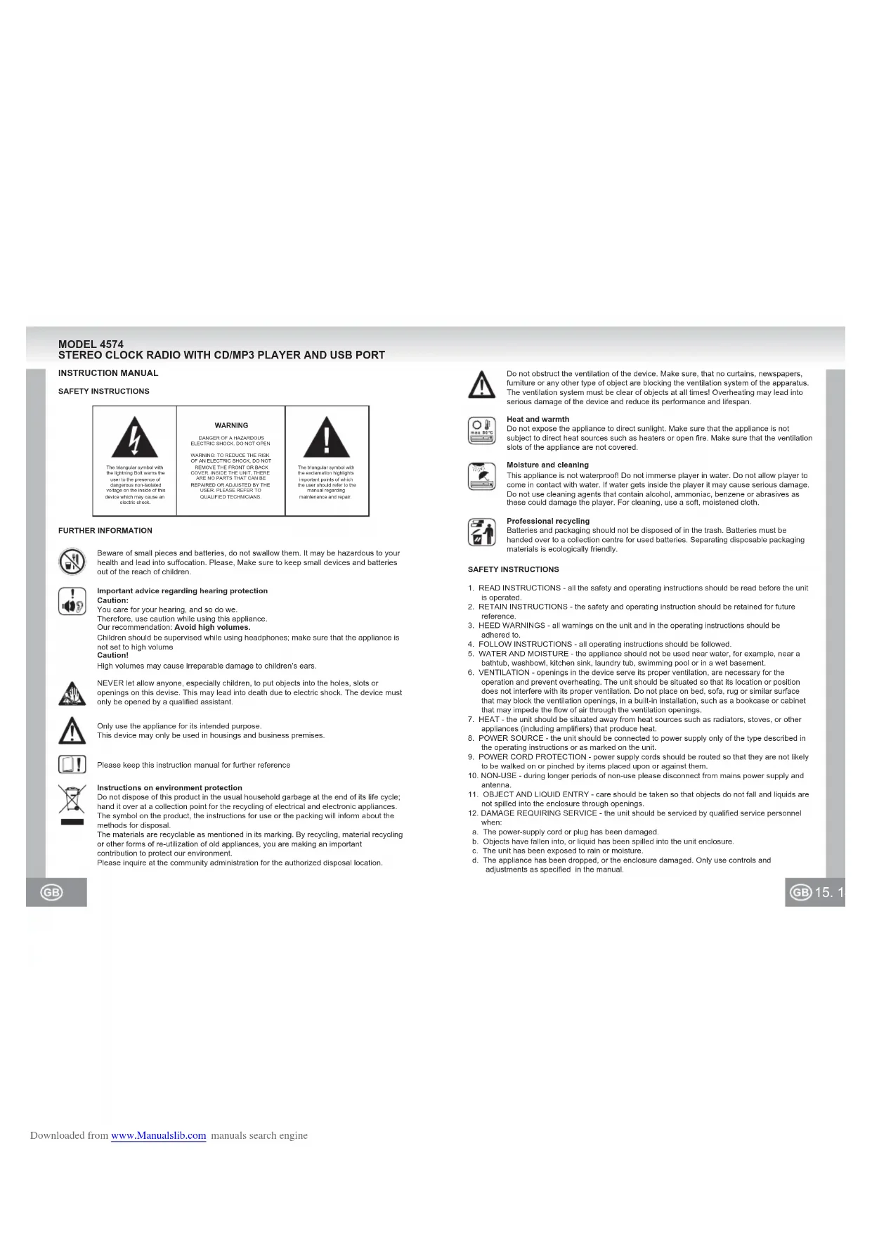 RICHTIG FALSCH Downloaded from www.Manualslib.com manuals search engine15. 14. INSTRUCTION MANUALSAFETY INSTRUCTIONSFURTHER INFORMATIONThe triangular symbol with the lightning Bolt warns the user to the presence of dangerous non-isolated voltage on the inside of this device which may cause an electric shock.The triangular symbol with the exclamation highlights important points of which the user should refer to the manual regarding maintenance and repair.WARNINGDANGER OF A HAZARDOUS ELECTRIC SHOCK. DO NOT OPENWARNING: TO REDUCE THE RISK OF AN ELECTRIC SHOCK, DO NOT REMOVE THE FRONT OR BACK COVER. INSIDE THE UNIT, THERE ARE NO PARTS THAT CAN BE REPAIRED OR ADJUSTED BY THE USER. PLEASE REFER TO QUALIFIED TECHNICIANS.Please keep this instruction manual for further referenceInstructions on environment protectionDo not dispose of this product in the usual household garbage at the end of its life cycle; hand it over at a collection point for the recycling of electrical and electronic appliances. The symbol on the product, the instructions for use or the packing will inform about the methods for disposal.The materials are recyclable as mentioned in its marking. By recycling, material recycling or other forms of re-utilization of old appliances, you are making an important contribution to protect our environment.Please inquire at the community administration for the authorized disposal location.NEVER let allow anyone, especially children, to put objects into the holes, slots or openings on this devise. This may lead into death due to electric shock. The device must only be opened by a qualified assistant.Beware of small pieces and batteries, do not swallow them. It may be hazardous to your health and lead into suffocation. Please, Make sure to keep small devices and batteries out of the reach of children.Important advice regarding hearing protectionCaution:You care for your hearing, and so do we.Therefore, use caution while using this appliance.Our recommendation: Avoid high volumes.Children should be supervised while using headphones; make sure that the appliance is not set to high volumeCaution!High volumes may cause irreparable damage to children’s ears.Only use the appliance for its intended purpose.This device may only be used in housings and business premises. MODEL 4574 STEREO CLOCK RADIO WITH CD/MP3 PLAYER AND USB PORT SAFETY INSTRUCTIONS1. READ INSTRUCTIONS - all the safety and operating instructions should be read before the unit is operated.2. RETAIN INSTRUCTIONS - the safety and operating instruction should be retained for future reference.3. HEED WARNINGS - all warnings on the unit and in the operating instructions should be adhered to.4. FOLLOW INSTRUCTIONS - all operating instructions should be followed.5. WATER AND MOISTURE - the appliance should not be used near water, for example, near a bathtub, washbowl, kitchen sink, laundry tub, swimming pool or in a wet basement.6. VENTILATION - openings in the device serve its proper ventilation, are necessary for the operation and prevent overheating. The unit should be situated so that its location or position does not interfere with its proper ventilation. Do not place on bed, sofa, rug or similar surface that may block the ventilation openings, in a built-in installation, such as a bookcase or cabinet that may impede the flow of air through the ventilation openings.7. HEAT - the unit should be situated away from heat sources such as radiators, stoves, or other appliances (including amplifiers) that produce heat.8. POWER SOURCE - the unit should be connected to power supply only of the type described in the operating instructions or as marked on the unit.9. POWER CORD PROTECTION - power supply cords should be routed so that they are not likely to be walked on or pinched by items placed upon or against them.10. NON-USE - during longer periods of non-use please disconnect from mains power supply and antenna.11. OBJECT AND LIQUID ENTRY - care should be taken so that objects do not fall and liquids are not spilled into the enclosure through openings. 12. DAMAGE REQUIRING SERVICE - the unit should be serviced by qualified service personnel when: a. The power-supply cord or plug has been damaged. b. Objects have fallen into, or liquid has been spilled into the unit enclosure. c. The unit has been exposed to rain or moisture. d. The appliance has been dropped, or the enclosure damaged. Only use controls and adjustments as specified in the manual.Do not obstruct the ventilation of the device. Make sure, that no curtains, newspapers, furniture or any other type of object are blocking the ventilation system of the apparatus. The ventilation system must be clear of objects at all times! Overheating may lead into serious damage of the device and reduce its performance and lifespan.Heat and warmthDo not expose the appliance to direct sunlight. Make sure that the appliance is not subject to direct heat sources such as heaters or open fire. Make sure that the ventilation slots of the appliance are not covered.Moisture and cleaningThis appliance is not waterproof! Do not immerse player in water. Do not allow player to come in contact with water. If water gets inside the player it may cause serious damage. Do not use cleaning agents that contain alcohol, ammoniac, benzene or abrasives as these could damage the player. For cleaning, use a soft, moistened cloth.Professional recyclingBatteries and packaging should not be disposed of in the trash. Batteries must be handed over to a collection centre for used batteries. Separating disposable packaging materials is ecologically friendly. Downloaded from www.Manualslib.com manuals search engine17. 16. e. The unit does not appear to operate normally. f. The unit displays serious changes in its performance.13. SERVICING - The user should not attempt to service the unit beyond that described in the user operating instructions. All other servicing should be referred to qualified service personnel.14. CLEANING - 