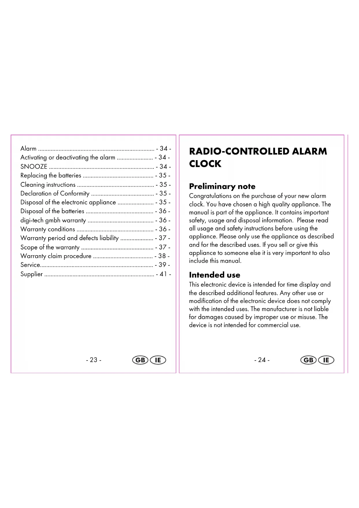 RADIO-CONTROLLED ALARM CLOCK Preliminary note Congratulations on the purchase of your new alarm clock. You have chosen a high quality appliance. The manual is part of the appliance. It contains important safety, usage and disposal information. Please read all usage and safety instructions before using the appliance. Please only use the appliance as described and for the described uses. If you sell or give this appliance to someone else it is very important to also include this manual. Intended use This electronic device is intended for time display and the described additional features. Any other use or modification of the electronic device does not comply with the intended uses. The manufacturer is not liable for damages caused by improper use or misuse. The device is not intended for commercial use.-