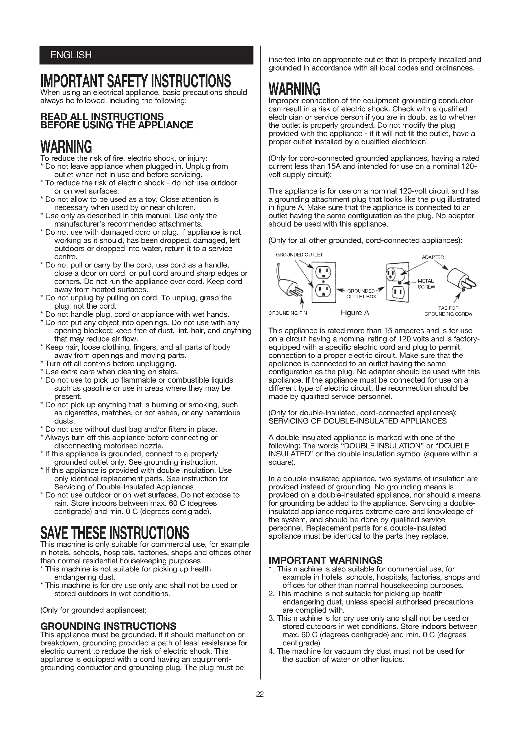 ENGLISH GROUNDING PIN GROUNDED OUTLET GROUNDED OUTLET BOX TAB FOR GROUNDING SCREW ADAPTER METAL SCREW Figure A5. Live conductors must not be vacuum cleaned by the machine for dry dust before their current has been switch off. This is to avoid creating a short-cut through the dust remaining in the nozzles and tubes.