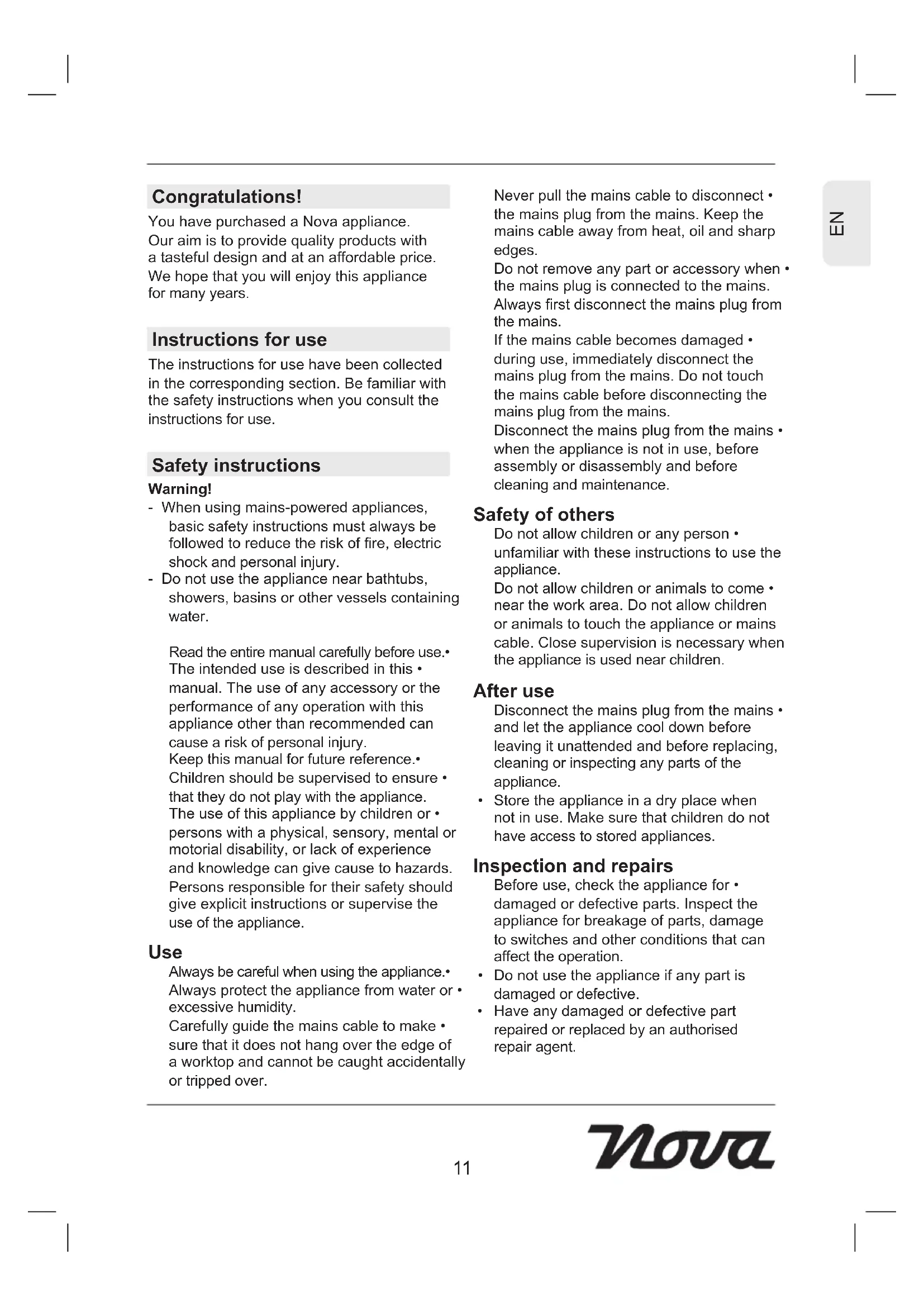 Congratulations! You have purchased a Nova appliance. Our aim is to provide quality products with a tasteful design and at an affordable price. We hope that you will enjoy this appliance for many years. Instructions for use The instructions for use have been collected in the corresponding section. Be familiar with the safety instructions when you consult the instructions for use. Safety instructions Warning! - When using mains-powered appliances, basic safety instructions must always be followed to reduce the risk of fire, electric shock and personal injury. - Do not use the appliance near bathtubs, showers, basins or other vessels containing water. Read the entire manual carefully before use.• The intended use is described in this • manual. The use of any accessory or the performance of any operation with this appliance other than recommended can cause a risk of personal injury. Keep this manual for future reference.• Children should be supervised to ensure • that they do not play with the appliance. The use of this appliance by children or • persons with a physical, sensory, mental or motorial disability, or lack of experience and knowledge can give cause to hazards. Persons responsible for their safety should give explicit instructions or supervise the use of the appliance. Use Always be careful when using the appliance.• Always protect the appliance from water or • excessive humidity. Carefully guide the mains cable to make • sure that it does not hang over the edge of a worktop and cannot be caught accidentally or tripped over. Never pull the mains cable to disconnect • the mains plug from the mains. Keep the mains cable away from heat, oil and sharp edges. Do not remove any part or accessory when • the mains plug is connected to the mains. Always first disconnect the mains plug from the mains. If the mains cable becomes damaged • during use, immediately disconnect the mains plug from the mains. Do not touch the mains cable before disconnecting the mains plug from the mains. Disconnect the mains plug from the mains • when the appliance is not in use, before assembly or disassembly and before cleaning and maintenance. Safety of others Do not allow children or any person • unfamiliar with these instructions to use the appliance. Do not allow children or animals to come • near the work area. Do not allow children or animals to touch the appliance or mains cable. Close supervision is necessary when the appliance is used near children. After use Disconnect the mains plug from the mains • and let the appliance cool down before leaving it unattended and before replacing, cleaning or inspecting any parts of the appliance. Store the appliance in a dry place when • not in use. Make sure that children do not have access to stored appliances. Inspection and repairs Before use, check the appliance for • damaged or defective parts. Inspect the appliance for breakage of parts, damage to switches and other conditions that can affect the operation. Do not use the appliance if any part is • damaged or defective. Have any damaged or defective part • repaired or replaced by an authorised repair agent.12