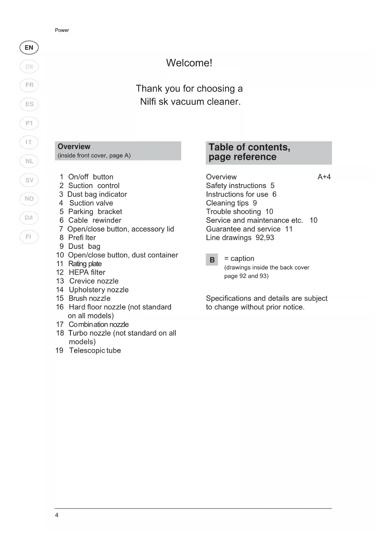 Table of contents, page reference Overview A+4 Safety instructions 5 Instructions for use 6 Cleaning tips 9 Trouble shooting 10 Service and maintenance etc. 10 Guarantee and service 11 Line drawings 92,93 Specifications and details are subject to change without prior notice. Overview (inside front cover, page A) 1 On/off button 2 Suction control 3 Dust bag indicator 4 Suction valve 5 Parking bracket 6 Cable rewinder 7 Open/close button, accessory lid 8 Prefi lter 9 Dust bag 10 Open/close button, dust container 11 Rating plate 12 HEPA fi lter 13 Crevice nozzle 14 Upholster y noz zle 15 Brush noz zl e 16 Har d fl oor nozzle (not standard on all models) 17 Co mbin ation nozzle 18 Turbo nozzle (not standard on all models) 19 Telescopic tube Welcome! Thank you for choosing a Nilfi sk vacuum cleaner.