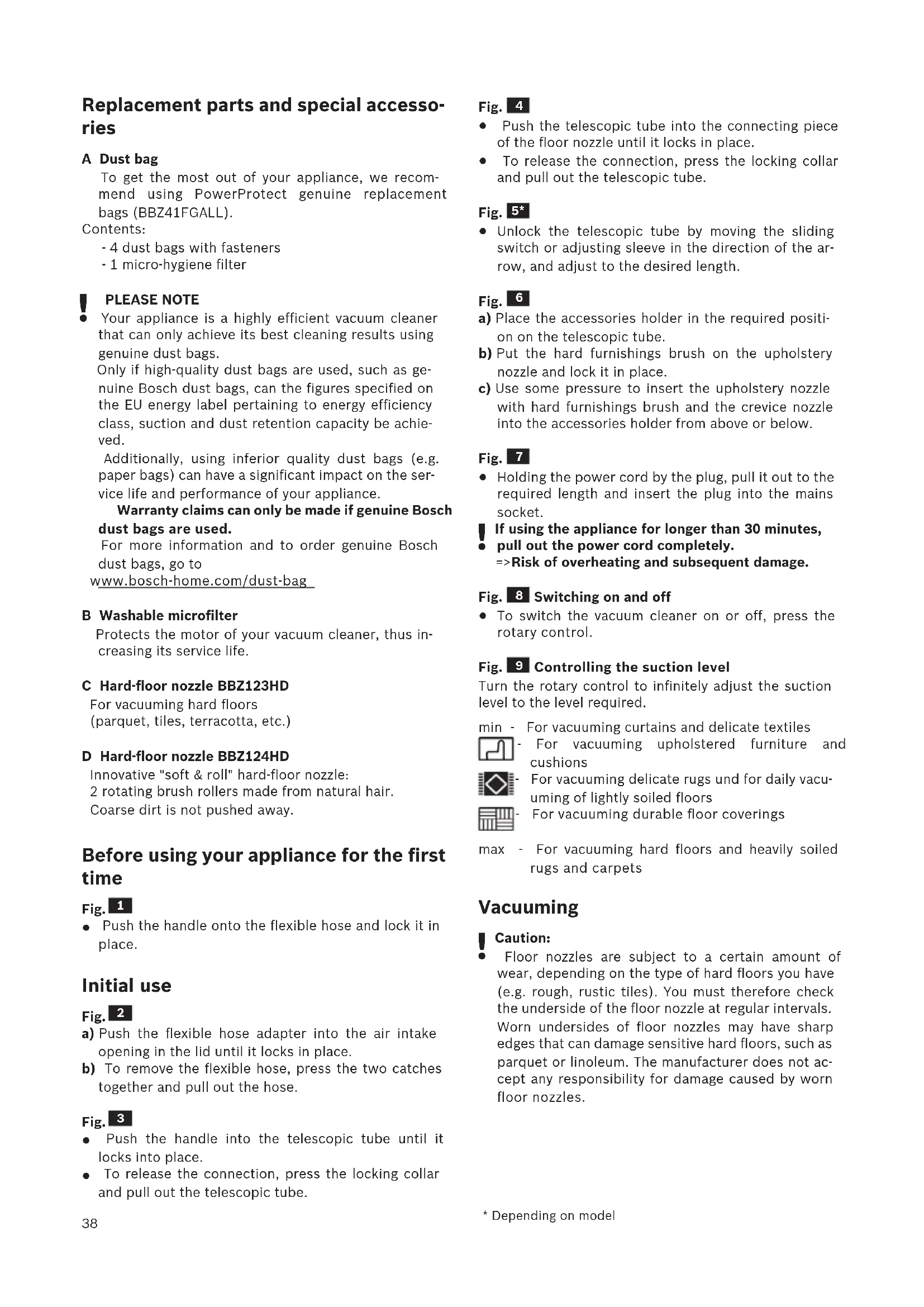 PLEASE NOTE Your appliance is a highly efficient vacuum cleaner that can only achieve its best cleaning results using genuine dust bags. Only if high-quality dust bags are used, such as ge- nuine Bosch dust bags, can the figures specified on the EU energy label pertaining to energy efficiency class, suction and dust retention capacity be achie- ved. Additionally, using inferior quality dust bags (e.g. paper bags) can have a significant impact on the ser- vice life and performance of your appliance. Warranty claims can only be made if genuine Bosch dust bags are used. For more information and to order genuine Bosch dust bags, go to www.bosch-home.com/dust-bag B Washable microfilter Protects the motor of your vacuum cleaner, thus in- creasing its service life. C Hard-floor nozzle BBZ123HD For vacuuming hard floors (parquet, tiles, terracotta, etc.) D Hard-floor nozzle BBZ124HD Innovative "soft & roll" hard-floor nozzle: 2 rotating brush rollers made from natural hair. Coarse dirt is not pushed away. Before using your appliance for the first time Fig.