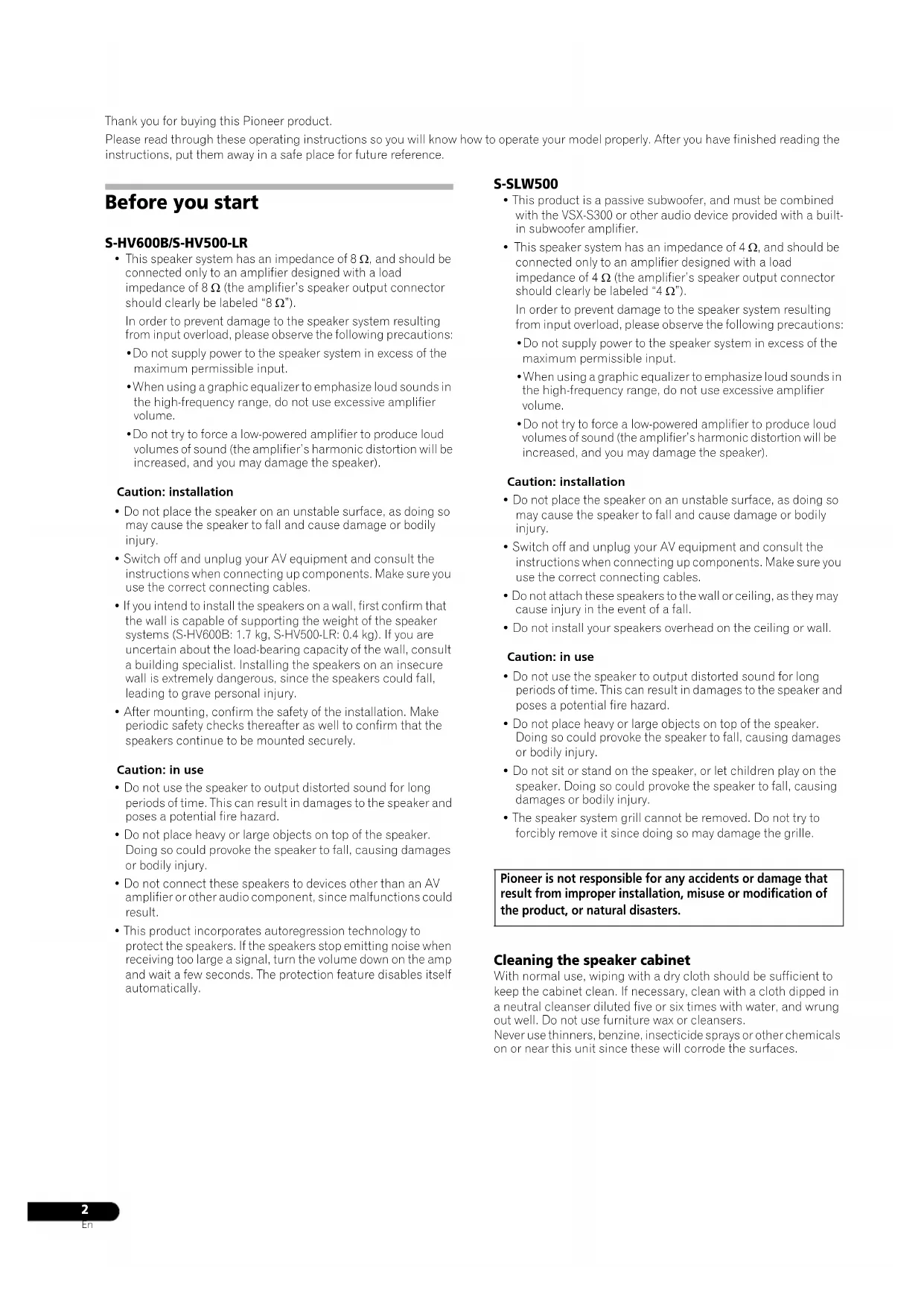 - The speaker system grill cannot be removed. Do not try to forcibly remove it since doing so may damage the grille. Cleaning the speaker cabinet With normal use, wiping with a dry cloth should be sufficient to keep the cabinet clean. If necessary, clean with a cloth dipped in a neutral cleanser diluted five or six times with water, and wrung out well. Do not use furniture wax or cleansers. Never use thinners, benzine, insecticide sprays or other chemicals on or near this unit since these will corrode the surfaces. Pioneer is not responsible for any accidents or damage that result from improper installation, misuse or modification of the product, or natural disasters. S-HV600B_S-HV500-LR_En.fm 2 ページ 2011年4月12日 火曜日 午後2時31分3