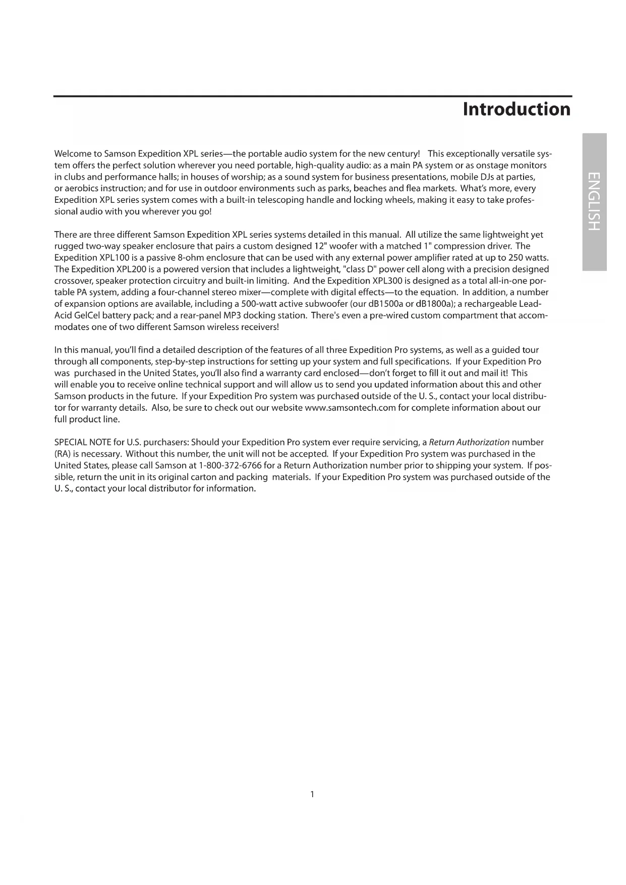 SPECIAL NOTE for U.S. purchasers: Should your Expedition Pro system ever require servicing, a Return Authorization number (RA) is necessary. Without this number, the unit will not be accepted. If your Expedition Pro system was purchased in the United States, please call Samson at 1-800-372-6766 for a Return Authorization number prior to shipping your system. If possible, return the unit in its original carton and packing materials. If your Expedition Pro system was purchased outside of the U. S., contact your local distributor for information.
