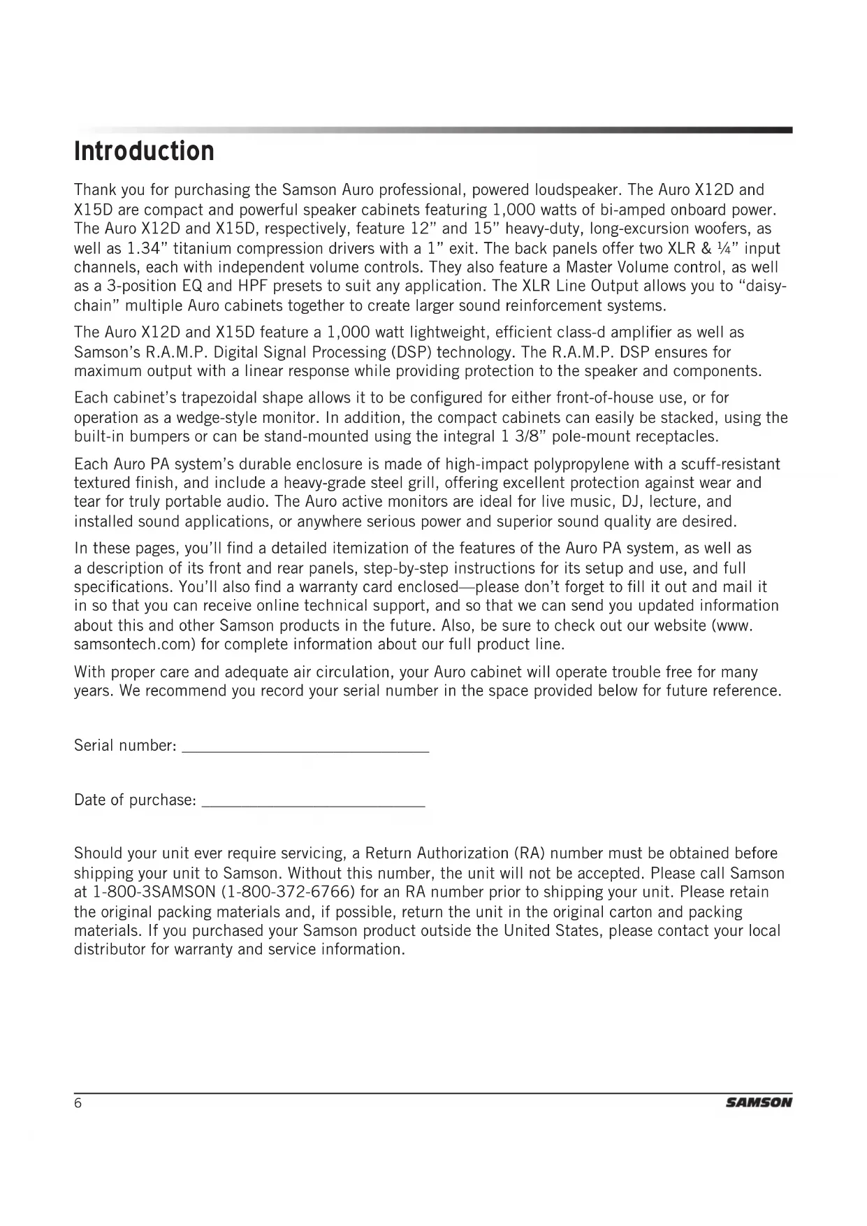 In these pages, you'll find a detailed itemization of the features of the Auro PA system, as well as a description of its front and rear panels, step-by-step instructions for its setup and use, and full specifications. You'll also find a warranty card enclosed—please don't forget to fill it out and mail it in so that you can receive online technical support, and so that we can send you updated information about this and other Samson products in the future. Also, be sure to check out our website (www.samsontech.com) for complete information about our full product line.
