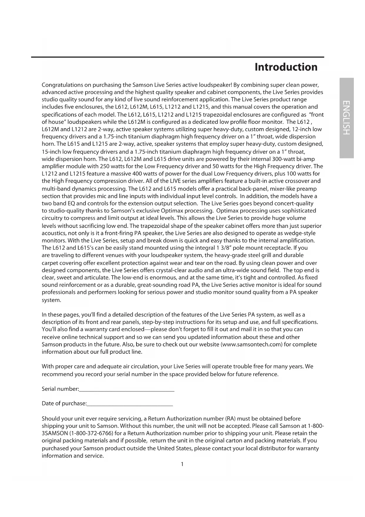 In these pages, you'll find a detailed description of the features of the Live Series PA system, as well as a description of its front and rear panels, step-by-step instructions for its setup and use, and full specifications. You'll also find a warranty card enclosed—please don't forget to fill it out and mail it in so that you can receive online technical support and so we can send you updated information about these and other Samson products in the future. Also, be sure to check out our website (www.samsontech.com) for complete information about our full product line.