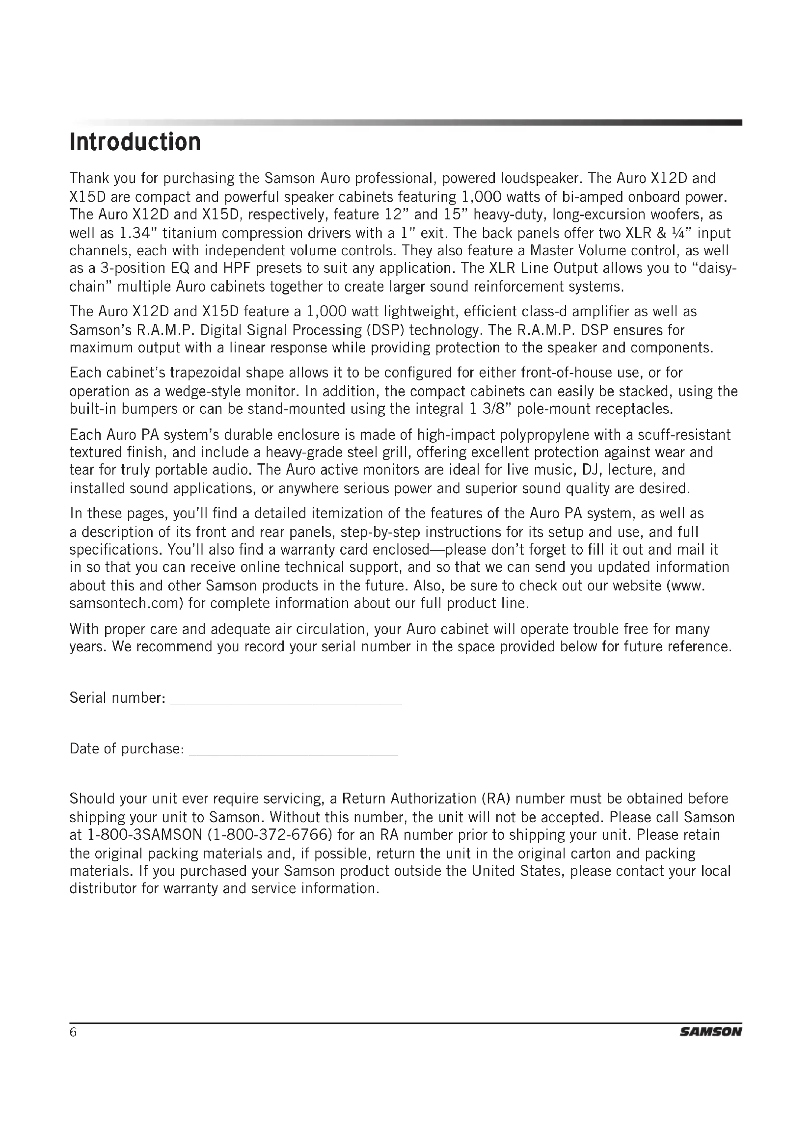 In these pages, you'll find a detailed itemization of the features of the Auro PA system, as well as a description of its front and rear panels, step-by-step instructions for its setup and use, and full specifications. You'll also find a warranty card enclosed—please don't forget to fill it out and mail it in so that you can receive online technical support, and so that we can send you updated information about this and other Samson products in the future. Also, be sure to check out our website (www.samsontech.com) for complete information about our full product line.