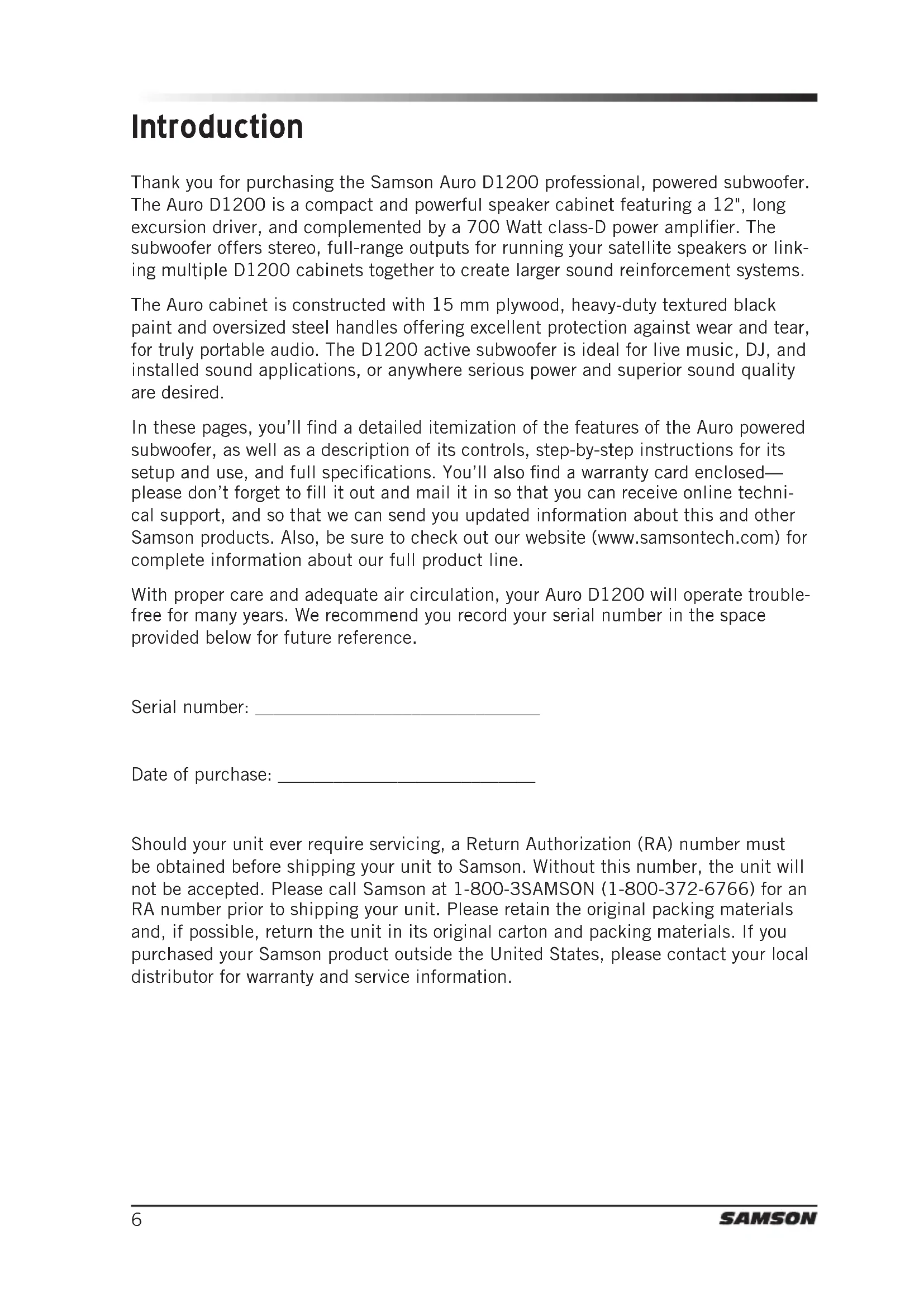 In these pages, you'll find a detailed itemization of the features of the Auro powered subwoofer, as well as a description of its controls, step-by-step instructions for its setup and use, and full specifications. You'll also find a warranty card enclosed—please don't forget to fill it out and mail it in so that you can receive online technical support, and so that we can send you updated information about this and other Samson products. Also, be sure to check out our website (www.samsontech.com) for complete information about our full product line.