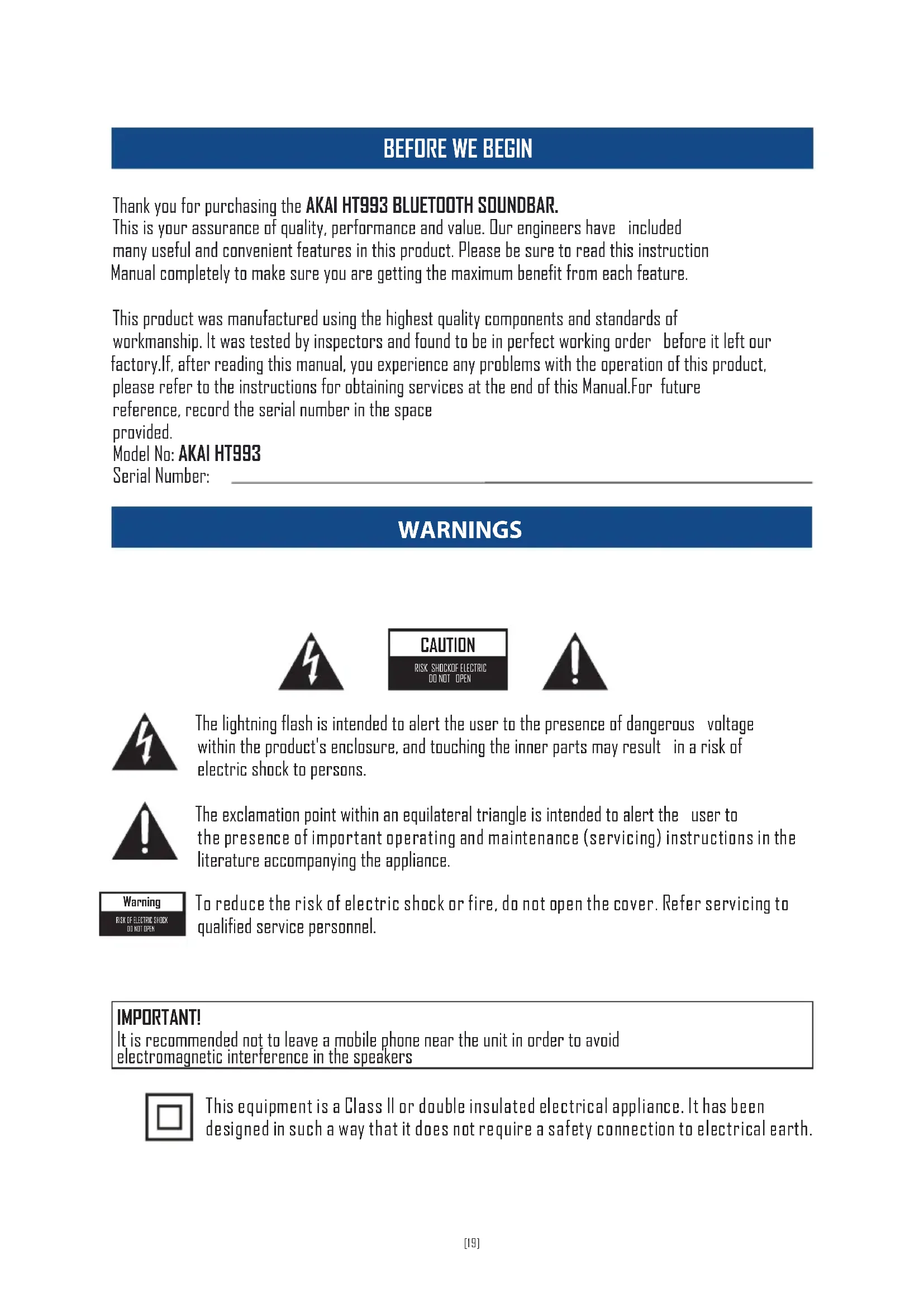 Thank you for purchasing the AKAI HT993 BLUETOOTH SOUNDBAR. This is your assurance of quality, performance and value. Our engineers have included many useful and convenient features in this product. Please be sure to read this instruction Manual completely to make sure you are getting the maximum benefit from each feature. This product was manufactured using the highest quality components and standards of workmanship. It was tested by inspectors and found to be in perfect working order before it left our factory.If, after reading this manual, you experience any problems with the operation of this product, please refer to the instructions for obtaining services at the end of this Manual.For future reference, record the serial number in the space provided. Model No: AKAI HT993 Serial Number: WARNINGS CAUTION