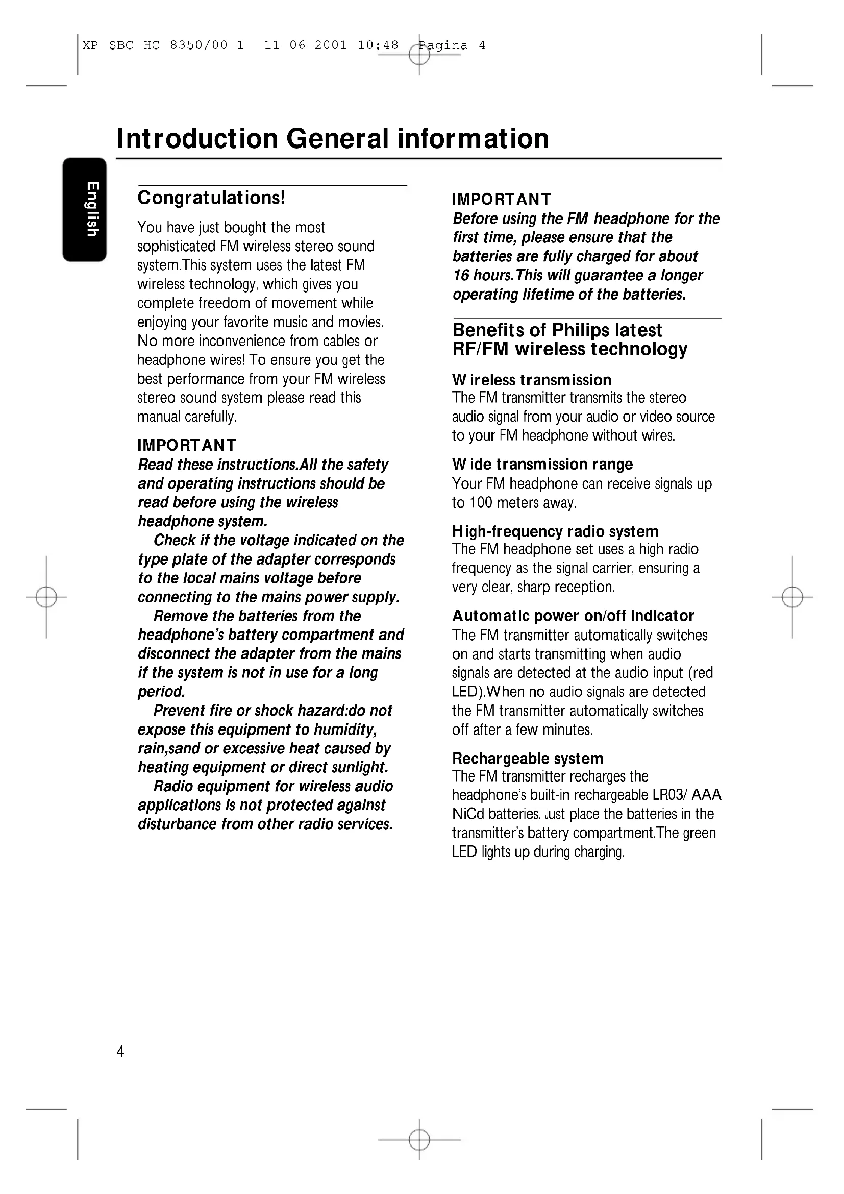 Congratulations! You have just bought the most sophisticated FM wireless stereo sound system.This system uses the latest FM wireless technology, which gives you complete freedom of movement while enjoying your favorite music and movies. No more inconvenience from cables or headphone wires! To ensure you get the best performance from your FM wireless stereo sound system please read this manual carefully. IMPORTANT Read these instructions.All the safety and operating instructions should be read before using the wireless headphone system. Check if the voltage indicated on the type plate of the adapter corresponds to the local mains voltage before connecting to the mains power supply. Remove the batteries from the headphone’s battery compartment and disconnect the adapter from the mains if the system is not in use for a long period. Prevent fire or shock hazard:do not expose this equipment to humidity, rain,sand or excessive heat caused by heating equipment or direct sunlight. Radio equipment for wireless audio applications is not protected against disturbance from other radio services. IMPORTANT Before using the FM headphone for the first time, please ensure that the batteries are fully charged for about 16 hours.This will guarantee a longer operating lifetime of the batteries. Benefits of Philips latest RF/FM wireless technology Wireless transmission The FM transmitter transmits the stereo audio signal from your audio or video source to your FM headphone without wires. Wide transmission range Your FM headphone can receive signals up to 100 meters away. High-frequency radio system The FM headphone set uses a high radio frequency as the signal carrier, ensuring a very clear, sharp reception. Automatic power on/off indicator The FM transmitter automatically switches on and starts transmitting when audio signals are detected at the audio input (red LED).When no audio signals are detected the FM transmitter automatically switches off after a few minutes. Rechargeable system The FM transmitter recharges the headphone’s built-in rechargeable LR03/ AAA NiCd batteries. Just place the batteries in the transmitter’s battery compartment.The green LED lights up during charging. Introduction General information XP SBC HC 8350/00-1 11-06-2001 10:48 Pagina 4English
