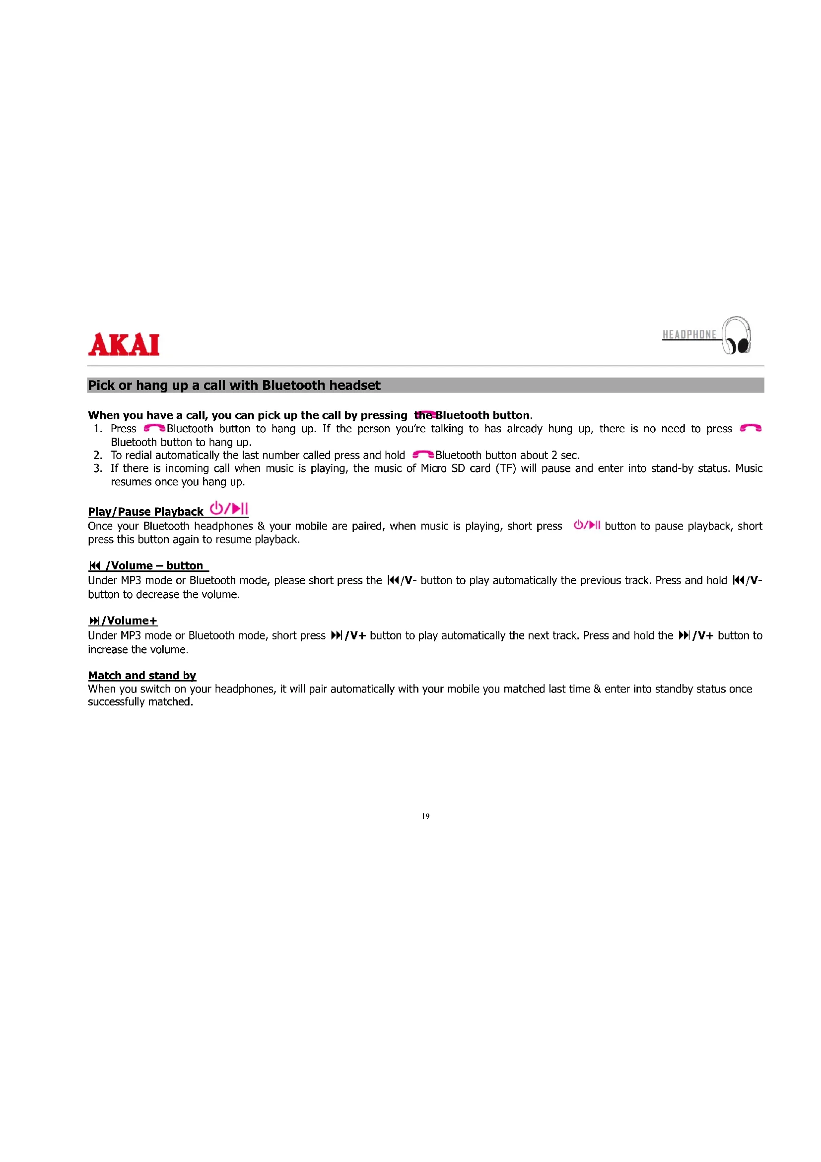 :short press to Play/Pause, hold this button to switch off. / V+”:short press to play next file, hold it to increase the volume. / V-”:short press to play previous program, hold it to decrease the volume. ““ ””:hold this button to switch among MP3 mode and Bluetooth mode. “MODE” Bluetooth multi-function button: short press to pick up or hang up the telephone calling, long press this button (+2 sec) to redial the last phone number.19 Pick or hang up a call with Bluetooth headset When you have a call, you can pick up the call by pressing the Bluetooth button.