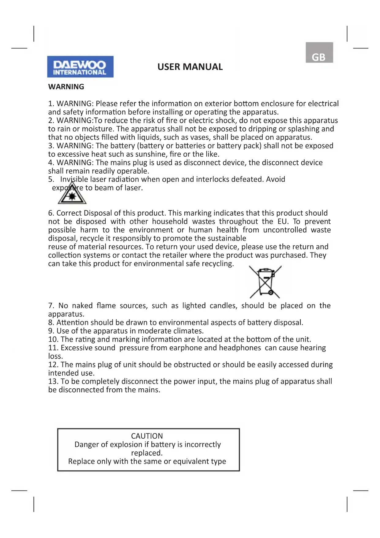 USER MANUAL CAUTION Danger of explosion if baery is incorrectly replaced. Replace only with the same or equivalent typeWARNING TO PREVENT FIRE OR SHOCK HAZARD DO NOT EXPOSE THIS APPLIANCE TO RAIN OR MOISTURE. The following label has been axed to the unit, lisng the proper procedure for working with the laser beam: