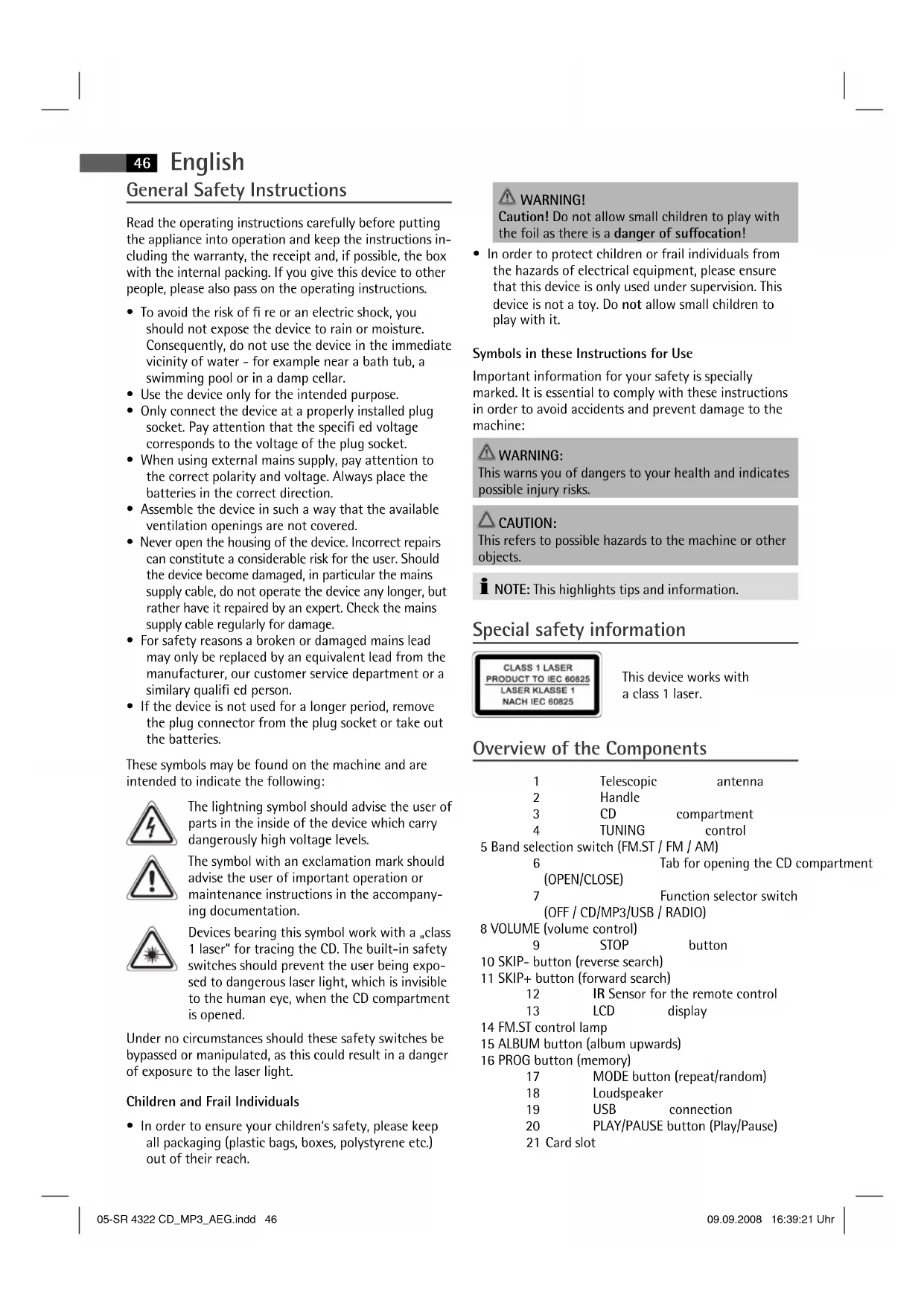 This warns you of dangers to your health and indicates possible injury risks. CAUTION: This refers to possible hazards to the machine or other objects. NOTE: This highlights tips and information. Special safety information This device works with a class 1 laser. Overview of the Components 1 Telescopic antenna 2 Handle 3 CD compartment 4 TUNING control 5 Band selection switch (FM.ST / FM / AM) 6 Tab for opening the CD compartment (OPEN/CLOSE) 7 Function selector switch (OFF / CD/MP3/USB / RADIO) 8 VOLUME (volume control) 9 STOP button 10 SKIP- button (reverse search) 11 SKIP+ button (forward search) 12 IR Sensor for the remote control 13 LCD display 14 FM.ST control lamp 15 ALBUM button (album upwards) 16 PROG button (memory) 17 MODE button (repeat/random) 18 Loudspeaker 19 USB connection 20 PLAY/PAUSE button (Play/Pause) 21 Card slot 05-SR 4322 CD_MP3_AEG.indd 4605-SR 4322 CD_MP3_AEG.indd 46 09.09.2008 16:39:21 Uhr09.09.2008 16:39:21 UhrEnglish