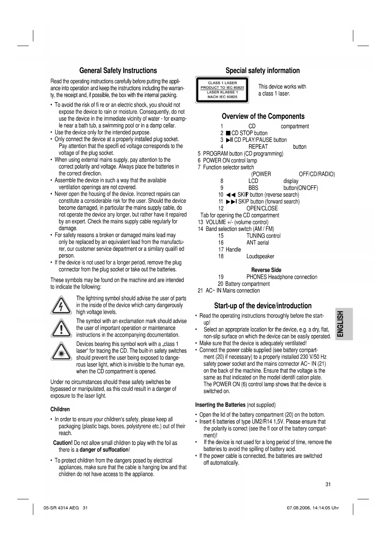 - Any marks on the surface can be wiped off with a slightly damp cloth without any additives. Technical Data Model: ....................................................................SR 4314 CD Power supply:........................................................230 V, 50 Hz Power consumption:...........................................................14 W Battery operation:.............................6 x 1,5 V, Type UM2/LR 14 Output rating:............................................................ 60 W PMPO Protection class: ...................................................................... ΙΙ Radio section: Frequency ranges: ......................VHF / FM 87,5 ~ 108 MHz .......................MW / AM 525 ~ 1615 kHz This device has been tested according to all relevant current CE guidelines, such as electromagnetic compatibility and low voltage directives, and has been constructed in accordance with the latest safety regulations. Subject to technical changes without prior notice! Guarantee The device supplied by our Company is covered by a 24 month guarantee starting on the date of purchase (receipt). During the life of the guarantee any fault of the device or its accessories ascribable to material or manufacturing defects will be eliminated free of charge by repairing or, at our discretion, by replacing it. The guarantee services do not entail an extension of the life of the guarantee nor do they give rise to any right to a new guarantee! Proof of the guarantee is provided by the proof of purchase. Without proof of purchase no free replacement or repair will be carried out. If you wish to make a claim under the guarantee please return the entire machine in the original packaging to your dealer together with the receipt. Defects to consumables or parts subject to wearing as well as cleaning, maintenance or the replacement of said parts are not covered by the guarantee and hence are to be paid! The guarantee lapses in case of unauthorized tampering. After the expiry of the guarantee After the expiry of the guarantee repairs can be carried by the competent dealer or repair service against the payment of the ensuing costs. Meaning of the “Dustbin” Symbol Protect our environment: do not dispose of electrical equipment in the domestic waste. Please return any electrical equipment that you will no longer use to the collection points provided for their disposal. This helps avoid the potential effects of incorrect disposal on the environment and human health. This will contribute to the recycling and other forms of reutilisati- on of electrical and electronic equipment. Information concerning where the equipment can be disposed of can be obtained from your local authority. 05-SR 4314 AEG 33 07.08.2006, 14:14:10 Uhr34