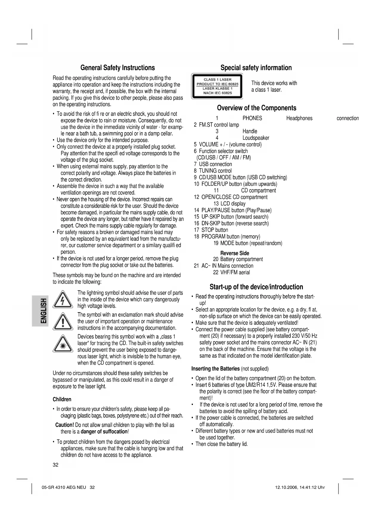 - To protect children from the dangers posed by electrical appliances, make sure that the cable is hanging low and that children do not have access to the appliance. Special safety information This device works with a class 1 laser. Overview of the Components 1 PHONES Headphones connection 2 FM.ST control lamp 3 Handle 4 Loudspeaker 5 VOLUME + / - (volume control) 6 Function selector switch (CD/USB / OFF / AM / FM) 7 USB connection 8 TUNING control 9 CD/USB MODE button (USB CD switching) 10 FOLDER/UP button (album upwards) 11 CD compartment 12 OPEN/CLOSE CD compartment 13 LCD display 14 PLAY/PAUSE button (Play/Pause) 15 UP-SKIP button (forward search) 16 DN-SKIP button (reverse search) 17 STOP button 18 PROGRAM button (memory) 19 MODE button (repeat/random) Reverse Side 20 Battery compartment 21 AC~ IN Mains connection 22 VHF/FM aerial Start-up of the device/introduction