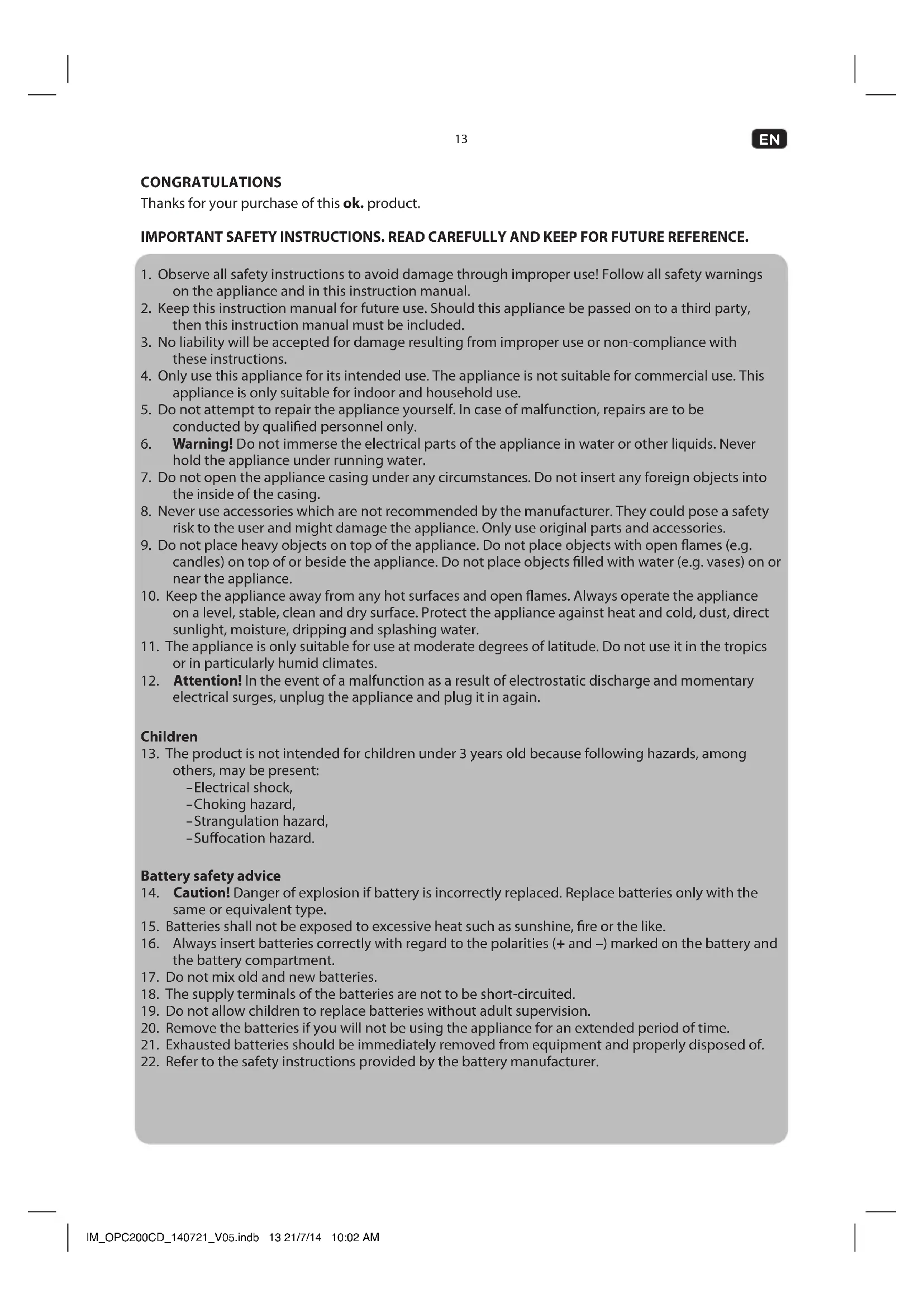 - Only hold a compact disc by its edges! SPECIFICATIONS Power supply: Batteries: 4 x 1.5 V (type C / LR14) (not included) Optional external power supply: 6 V 1 A The used external transformer must be a safety isolated transformer for toys. Supported audio formats: CD/CD-R DISPOSAL The crossed-out wheeled bin logo requires the separate collection of waste electric and electronic equipment (WEEE). Electric and electronic equipment may contain dangerous and hazardous substances. Do not dispose of this appliance as unsorted municipal waste. Return it to a designated collection point for the recycling of WEEE. By doing so, you will help to conserve resources and protect the environment. Contact your retailer or local authorities for more information. IM_OPC200CD_140721_V05.indb 17 21/7/14 10:02 AM18