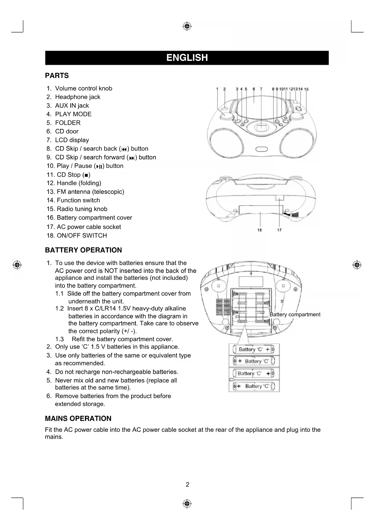 - Only use 'C' 1.5V batteries in this appliance.