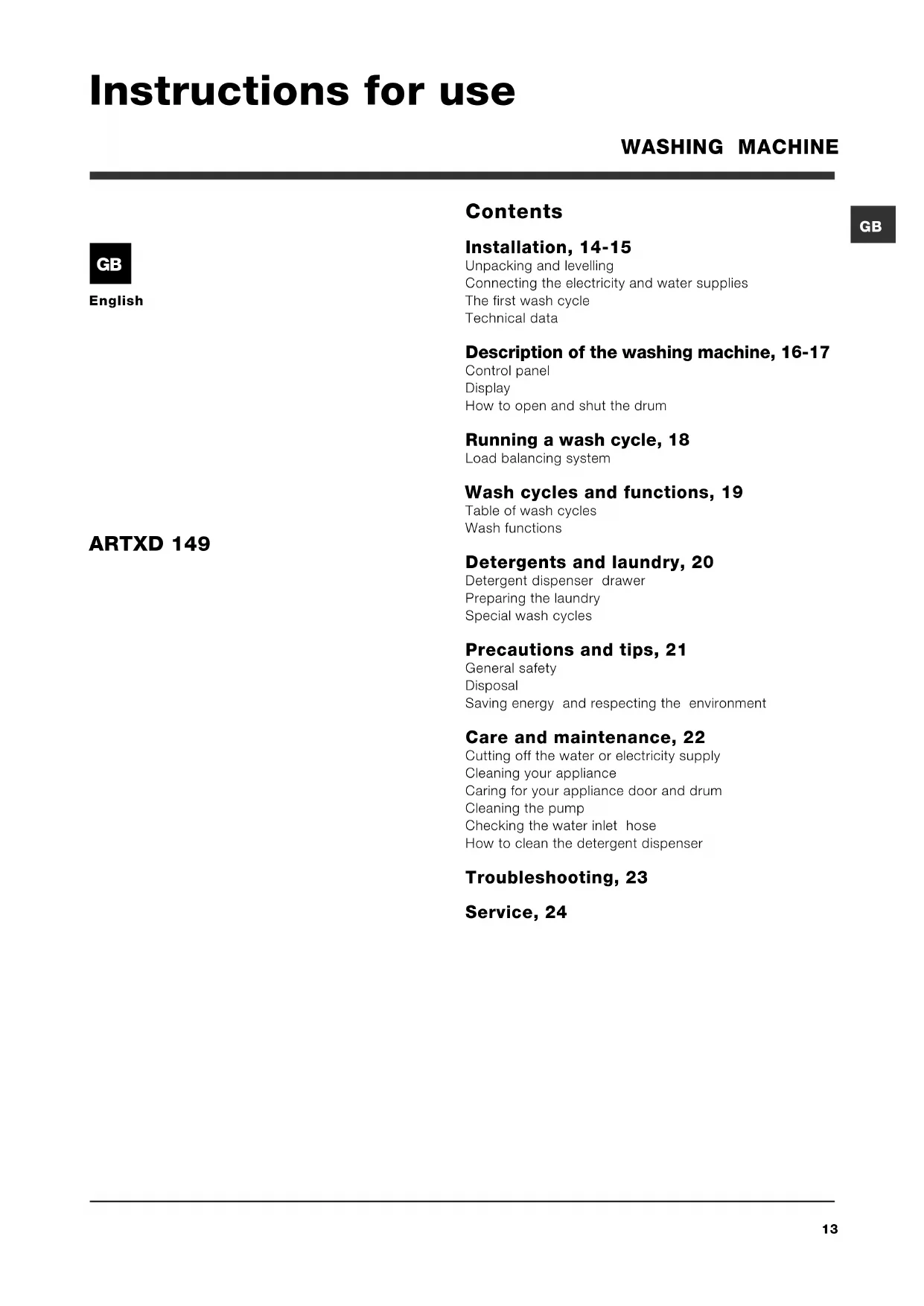 Contents Installation, 14-15 Unpacking and levelling Connecting the electricity and water supplies The first wash cycle Technical data Description of the washing machine, 16-17 Control panel Display How to open and shut the drum Running a wash cycle, 18 Load balancing system Wash cycles and functions, 19 Table of wash cycles Wash functions Detergents and laundry, 20 Detergent dispenser drawer Preparing the laundry Special wash cycles Precautions and tips, 21 General safety Disposal Saving energy and respecting the environment Care and maintenance, 22 Cutting off the water or electricity supply Cleaning your appliance Caring for your appliance door and drum Cleaning the pump Checking the water inlet hose How to clean the detergent dispenser Troubleshooting, 23 Service, 24 ARTXD 149 Instructions for use WASHING MACHINE English GB14