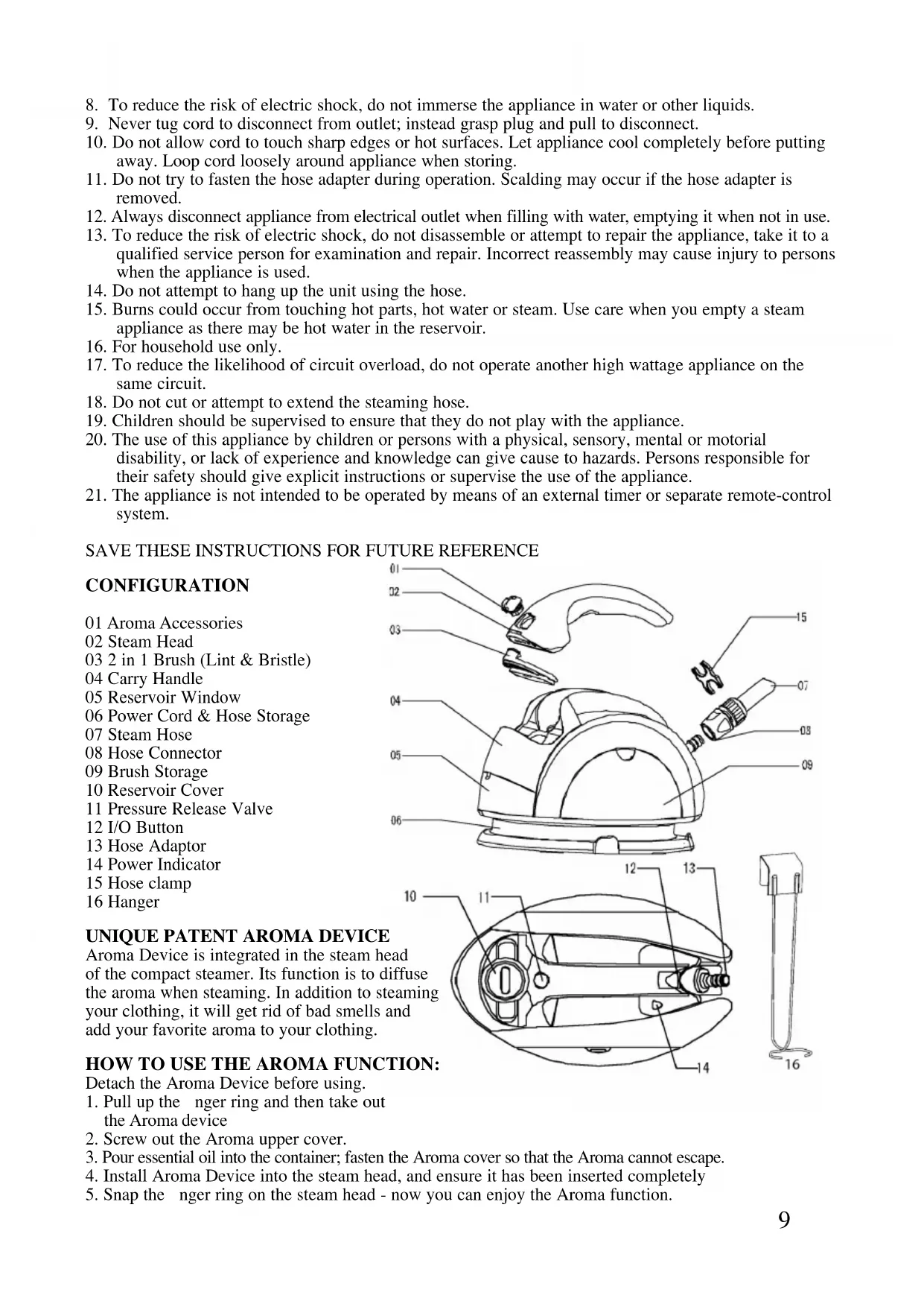 After turning on the steamer, steam will come through the hose and pass through the Aroma Device as well because it is situated in the head of the steamer. Essential oil will diffuse on your clothing. As a result, your clothing will be infused with your favourite aroma after ironing. CAUTION: Please DON’T take out the Aroma device when it is operating. PARTS OF THE AROMA DEVICE:
