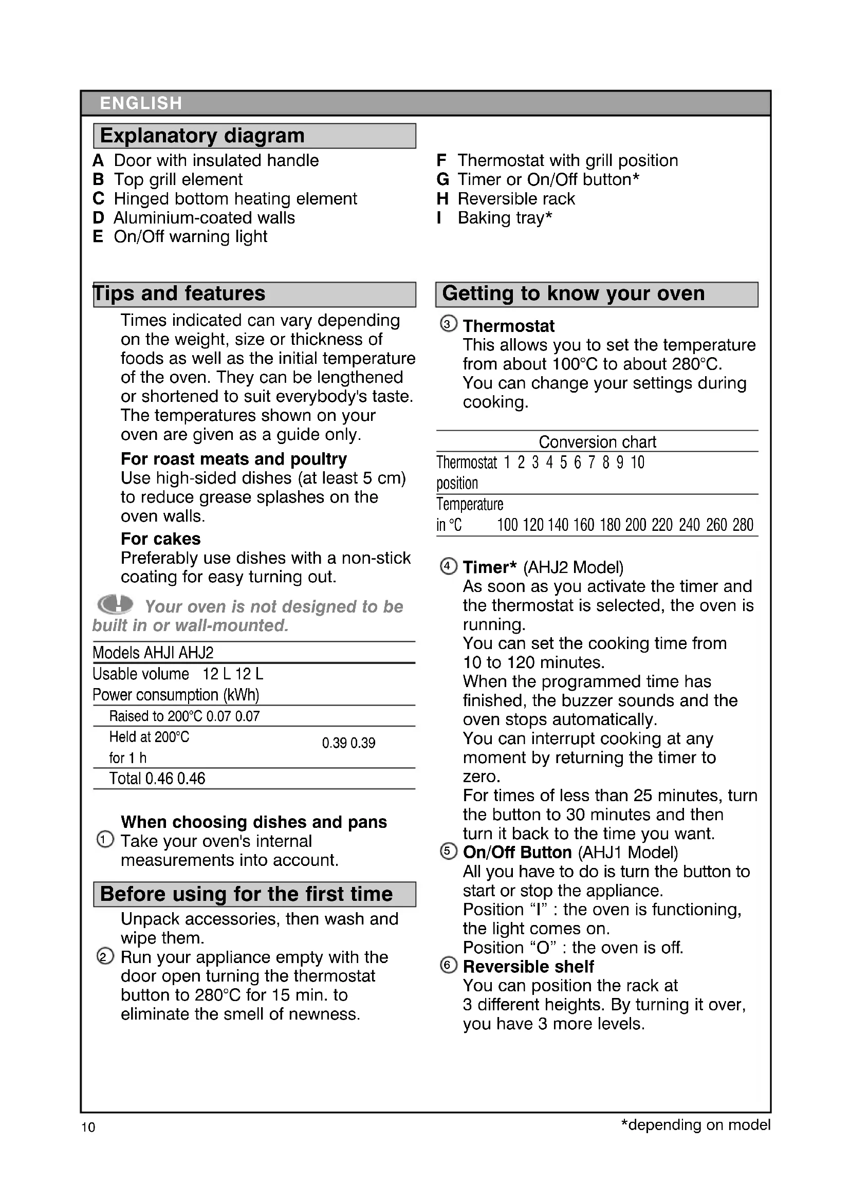 for 1 h Total 0.46 0.46 When choosing dishes and pans Take your oven's internal measurements into account. Before using for the first time Unpack accessories, then wash and wipe them. Run your appliance empty with the door open turning the thermostat button to 280°C for 15 min. to eliminate the smell of newness. Getting to know your oven Thermostat This allows you to set the temperature from about 100°C to about 280°C. You can change your settings during cooking. Conversion chart Thermostat 1 2 3 4 5 6 7 8 9 10 position Temperature in °C 100 120 140 160 180 200 220 240 260 280 Timer* (AHJ2 Model) As soon as you activate the timer and the thermostat is selected, the oven is running. You can set the cooking time from 10 to 120 minutes. When the programmed time has finished, the buzzer sounds and the oven stops automatically. You can interrupt cooking at any moment by returning the timer to zero. For times of less than 25 minutes, turn the button to 30 minutes and then turn it back to the time you want. On/Off Button (AHJ1 Model) All you have to do is turn the button to start or stop the appliance. Position “I” : the oven is functioning, the light comes on. Position “O” : the oven is off. Reversible shelf You can position the rack at 3 different heights. By turning it over, you have 3 more levels.