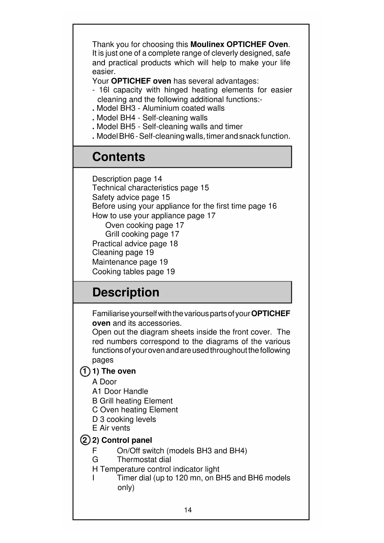 GRILL18 closing to enable the air to circulate during grilling. Do not try to force the door shut. - Place a dish containing a little water on the lower element (this does not heat up during grilling) to catch any dripping fat during cooking. . For models BH3 and BH4 turn the on/off switch (F) to position «I» (approximately 4 mins preheating time). . For models BH5 and BH6, turn the timer dial to the required cooking time plus approximately 4 minutes pre- heating time. Note : For a cooking time less than 25 minutes set the timer dial (I) to 30 minutes and turn it back to the required cooking time. - The temperature control indicator light will light up. - Place the food to be grilled on the grid shelf on level 3. The height and position of the grid shelf shall be determined by the size of the food to be grilled. - Food should be at least 2 cm from the grill element. - Keep an eye on your food and turn it half-way through the cooking process. . For models BH3 and BH4, when the cooking time has elapsed switch the grill off by pressing the Stop/Start button (F) to the «0» position. . For models BH5 and BH6 with timer, the grill will switch off automatically when the cooking time has elapsed (the oven gives off an audible signal to indicate the end of the cooking process). - Open the door and remove your food. During cooking spitting fat which comes into contact with the grill element can catch fire. Do not worry. This will go out and will not cause any damage. Once grilling is finished, clean any fat that may have spilled on to the lower element and the back wall of the oven. Practical advice Cooking food always produces steam and occasionally smoke from the front of the oven. Smoke and smells can be reduced by always keeping the oven walls clean. They can also be reduced by : - placing a dish containing a little water at the start of cooking process, - by using the correct cooking temperature and lowering it if it appears too hot, - by preferably using earthenware dishes.19 Cleaning - Unplug the oven and allow it to cool completely before any cleaning. - For ease of cleaning wipe a damp soapy sponge over the warm outside walls of the oven. Dry carefully. - The interior walls are covered in a self-cleaning enamel (except model BH3). To preserve their efficiency and ensure that they will last, wipe any spills of fat or smoke with a damp, soapy sponge as soon as they appear and then set the oven for 30 mins on 270°C. - The interior walls of model BH3 are aluminium coated and should be wiped with a sponge dipped in hot soapy water. - To thoroughly clean the roof (top panel) pull down the grill element and wipe with a sponge dipped in hot soapy water. - Replace the grill element to its proper position when cleaning is complete. . To thoroughly clean the base (lower panel), lift the lower element and wipe with a sponge dipped in hot soapy water. . The grid shelf and the plate (on certain models) can be washed with hot water and washing-up liquid. - Do not use abrasive pads or cloths, scouring powders or oven cleaning products to clean these ovens. Maintenance If your appliance does not work contact your local dealer or Moulinex Service Agent (see list in Moulinex Service leaflet). Changing the Mains Lead : If the mains lead or the plug are damaged, do not use your appliance. In order to avoid any accident, they must be replaced by an approved Moulinex Centre (see list in the leaflet "Moulinex Service"). Cooking Tables Table showing temperatures on the Optichef oven compared to temperatures shown in certain cookery books: 90°C : 1-2 210°C : 7-8 120°C : 2-3 240°C : 8-9 150°C : 3-4 270°C : 9-10 180°C : 5-6 All the times and temperatures stated are only to be used as a guideline. They can vary depending on which recipe or dish is being prepared.