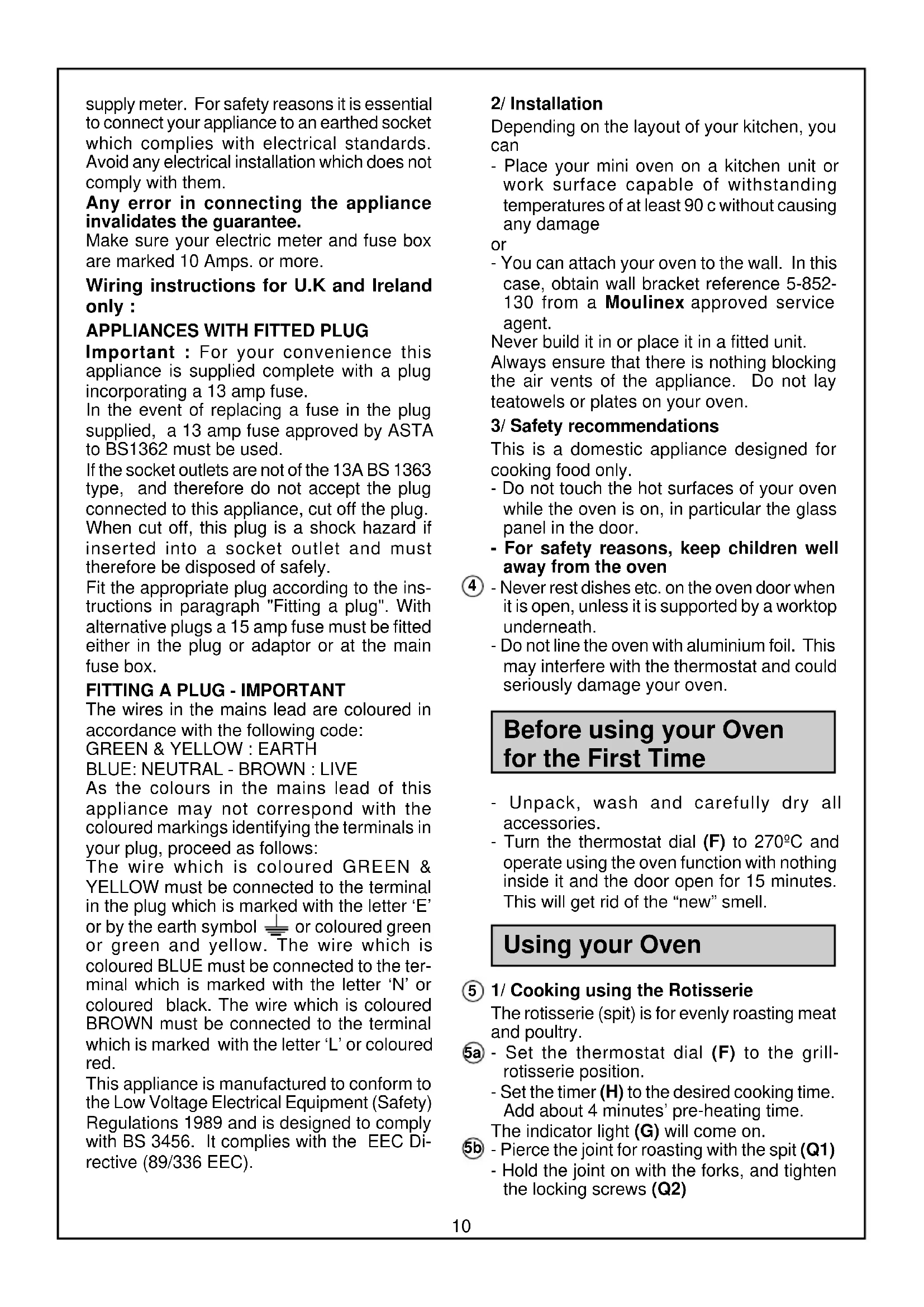 - You can attach your oven to the wall. In this case, obtain wall bracket reference 5-852- 130 from a Moulinex approved service agent. Never build it in or place it in a fitted unit. Always ensure that there is nothing blocking the air vents of the appliance. Do not lay teatowels or plates on your oven. 3/ Safety recommendations This is a domestic appliance designed for cooking food only. - Do not touch the hot surfaces of your oven while the oven is on, in particular the glass panel in the door. - For safety reasons, keep children well away from the oven - Never rest dishes etc. on the oven door when it is open, unless it is supported by a worktop underneath. - Do not line the oven with aluminium foil. This may interfere with the thermostat and could seriously damage your oven. Before using your Oven for the First Time - Unpack, wash and carefully dry all accessories. - Turn the thermostat dial (F) to 270ºC and operate using the oven function with nothing inside it and the door open for 15 minutes. This will get rid of the “new” smell. Using your Oven 1/ Cooking using the Rotisserie The rotisserie (spit) is for evenly roasting meat and poultry. - Set the thermostat dial (F) to the grill- rotisserie position. - Set the timer (H) to the desired cooking time. Add about 4 minutes’ pre-heating time. The indicator light (G) will come on. - Pierce the joint for roasting with the spit (Q1) - Hold the joint on with the forks, and tighten the locking screws (Q2)