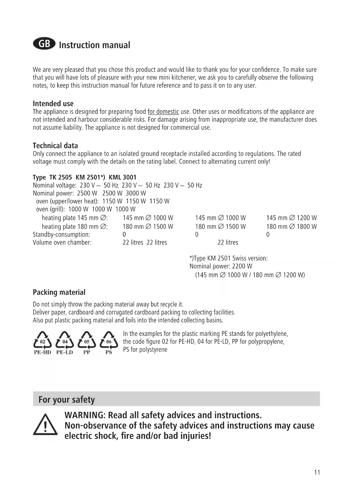 We are very pleased that you chose this product and would like to thank you for your confidence. To make sure that you will have lots of pleasure with your new mini kitchener, we ask you to carefully observe the following notes, to keep this instruction manual for future reference and to pass it on to any user. Intended use The appliance is designed for preparing food for domestic use. Other uses or modifications of the appliance are not intended and harbour considerable risks. For damage arising from inappropriate use, the manufacturer does not assume liability. The appliance is not designed for commercial use. Technical data Only connect the appliance to an isolated ground receptacle installed according to regulations. The rated voltage must comply with the details on the rating label. Connect to alternating current only! Type TK 2505 KM 2501*) KML 3001 Nominal voltage: 230 V ~ 50 Hz 230 V ~ 50 Hz 230 V ~ 50 Hz Nominal power: 2500 W 2500 W 3000 W oven (upper/lower heat): 1150 W 1150 W 1150 W oven (grill): 1000 W 1000 W 1000 W heating plate 145 mm ∅: 145 mm ∅ 1000 W 145 mm ∅ 1000 W 145 mm ∅ 1200 W heating plate 180 mm ∅: 180 mm ∅ 1500 W 180 mm ∅ 1500 W 180 mm ∅ 1800 W Standby-consumption: 0 0 0 Volume oven chamber: 22 litres 22 litres 22 litres *)Type KM 2501 Swiss version: Nominal power: 2200 W (145 mm ∅ 1000 W / 180 mm ∅ 1200 W) Packing material Do not simply throw the packing material away but recycle it. Deliver paper, cardboard and corrugated cardboard packing to collecting facilities. Also put plastic packing material and foils into the intended collecting basins. In the examples for the plastic marking PE stands for polyethylene, the code figure 02 for PE-HD, 04 for PE-LD, PP for polypropylene, PS for polystyrene12 General safety advices: