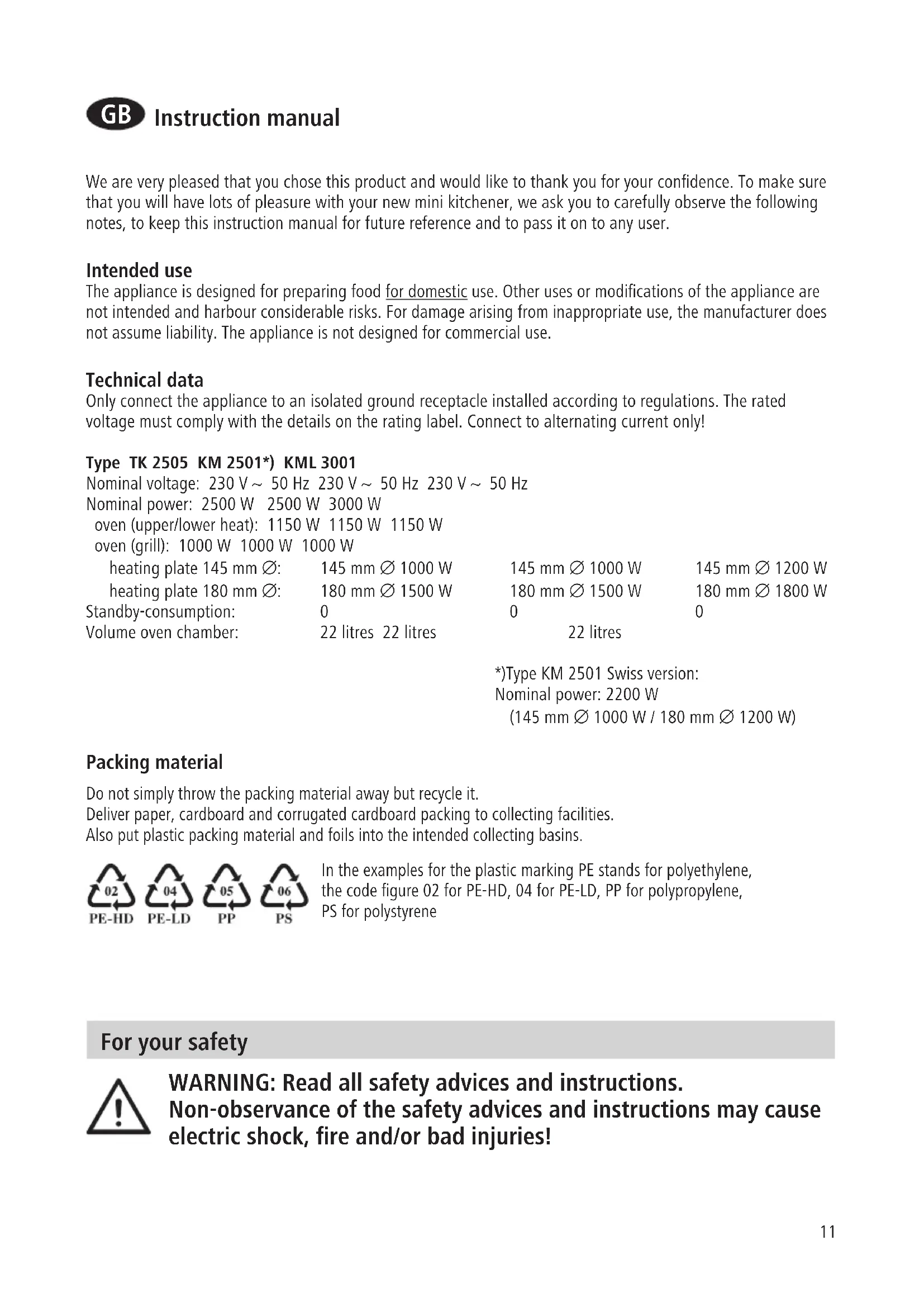 We are very pleased that you chose this product and would like to thank you for your confidence. To make sure that you will have lots of pleasure with your new mini kitchener, we ask you to carefully observe the following notes, to keep this instruction manual for future reference and to pass it on to any user. Intended use The appliance is designed for preparing food for domestic use. Other uses or modifications of the appliance are not intended and harbour considerable risks. For damage arising from inappropriate use, the manufacturer does not assume liability. The appliance is not designed for commercial use. Technical data Only connect the appliance to an isolated ground receptacle installed according to regulations. The rated voltage must comply with the details on the rating label. Connect to alternating current only! Type TK 2505 KM 2501*) KML 3001 Nominal voltage: 230 V ~ 50 Hz 230 V ~ 50 Hz 230 V ~ 50 Hz Nominal power: 2500 W 2500 W 3000 W oven (upper/lower heat): 1150 W 1150 W 1150 W oven (grill): 1000 W 1000 W 1000 W heating plate 145 mm ∅: 145 mm ∅ 1000 W 145 mm ∅ 1000 W 145 mm ∅ 1200 W heating plate 180 mm ∅: 180 mm ∅ 1500 W 180 mm ∅ 1500 W 180 mm ∅ 1800 W Standby-consumption: 0 0 0 Volume oven chamber: 22 litres 22 litres 22 litres *)Type KM 2501 Swiss version: Nominal power: 2200 W (145 mm ∅ 1000 W / 180 mm ∅ 1200 W) Packing material Do not simply throw the packing material away but recycle it. Deliver paper, cardboard and corrugated cardboard packing to collecting facilities. Also put plastic packing material and foils into the intended collecting basins. In the examples for the plastic marking PE stands for polyethylene, the code figure 02 for PE-HD, 04 for PE-LD, PP for polypropylene, PS for polystyrene12 General safety advices: