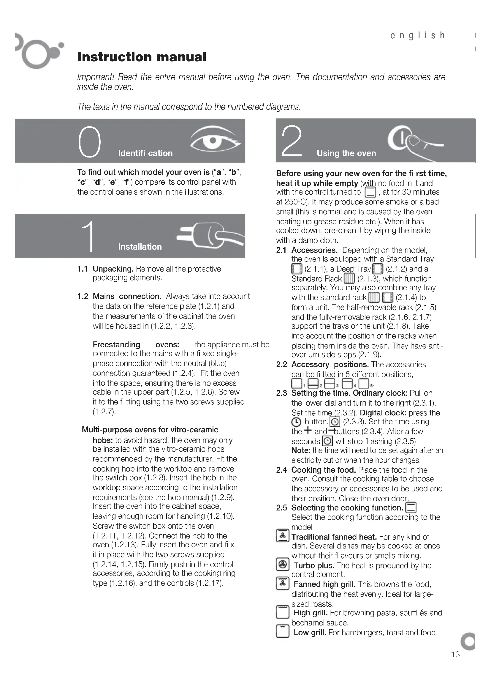 Installation Using the oven To fi nd out which model your oven is (“a”, “b”, “c”, “d”, “e”, “f”) compare its control panel with the control panels shown in the illustrations.